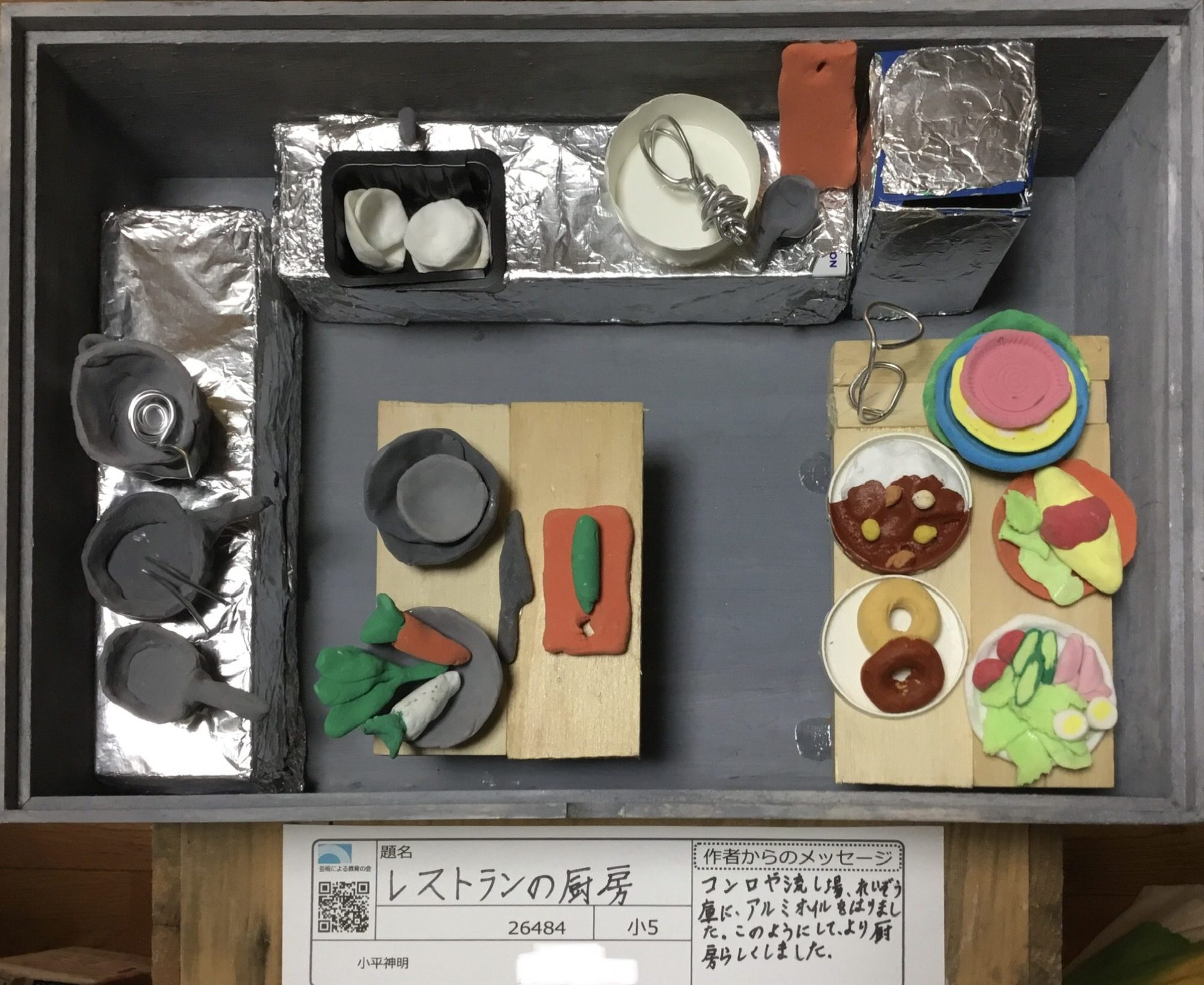 わかめせんせい 先生2025年12月31日 6:13 PM satsukiさんへ 😊 この作品、見た瞬間に「本当に厨房を上からのぞいているみたい!」と感じました🍳 コンロや調理台、食材の置き方まで、とても具体的で、 **「料理をしている動き」や「忙しさ」**が自然と伝わってきます✨ アルミホイルのキラキラした感じや、 お皿にのった料理の色のちがいも工夫されていて、 見ている人が「次は何を作っているのかな?」と想像したくなる作品です🥕🍩 道具や食べ物を一つ一つていねいに作って並べたところに、 satsukiさんの観察力とこだわりがしっかり出ています👏 この「場面を丸ごと作る力」は、とても大きな魅力ですよ✨ ログインして返信する ↓
