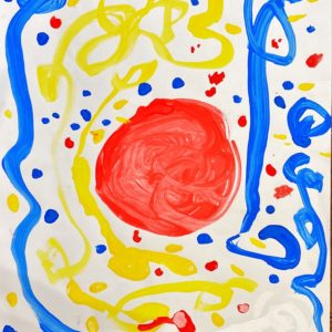 下の草原の黄緑もすがすがしく、画面の中で空としっかり呼吸しあっています。右上の赤い太陽がポンと入ることで、色のリズムが生まれて、作品全体がぐっと明るくなりましたね☀️