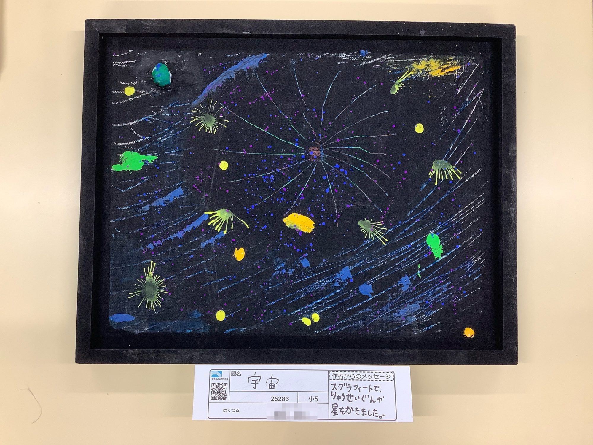 スクラッチの線と絵の具の飛び方が重なり、静かな闇の中で星が生まれては流れていく時間を感じました。