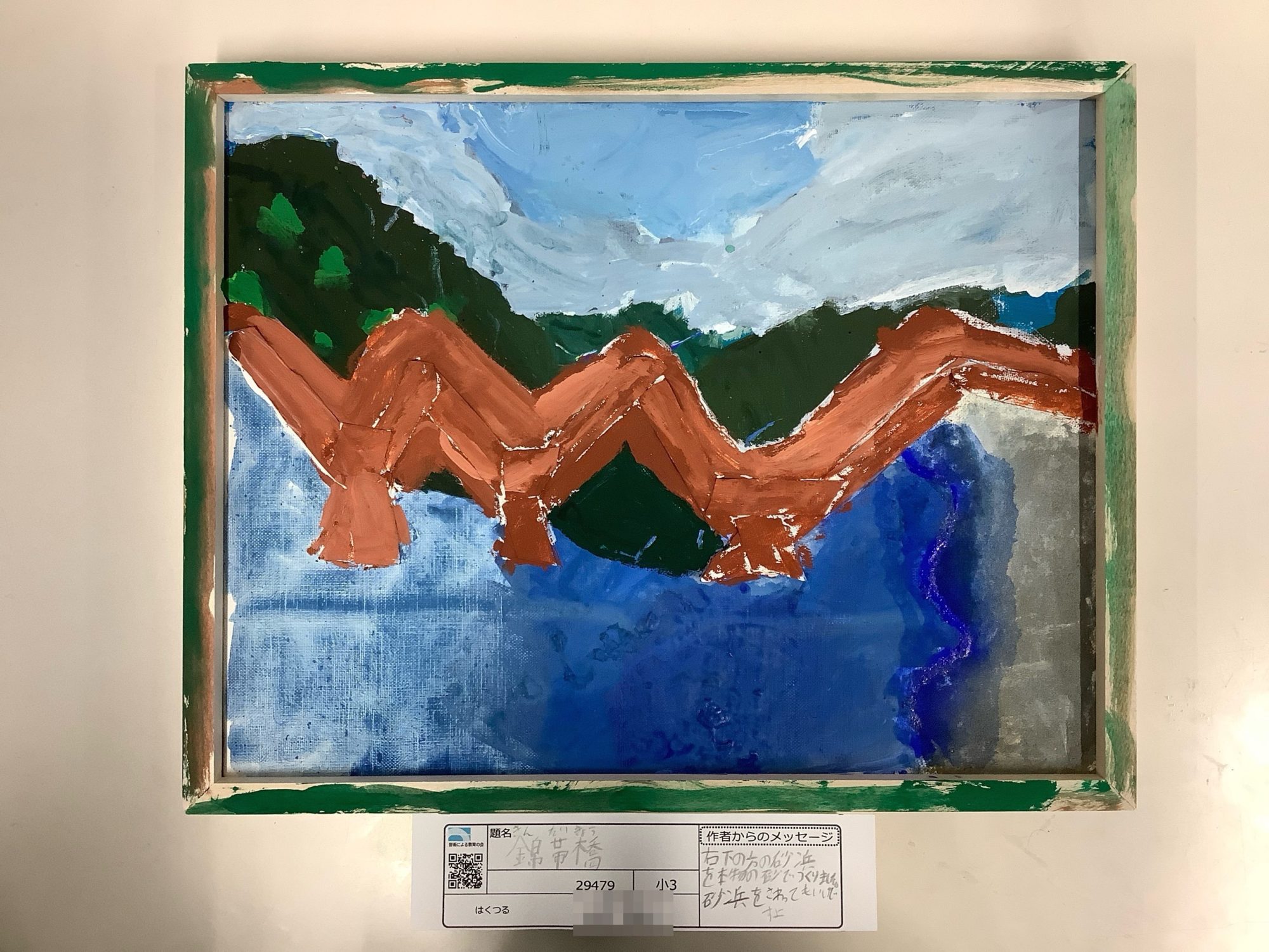 わかめせんせい 先生2026年1月1日 4:54 PM kanatoさん。 大きくうねる橋の形が、画面の真ん中を力強く横切っていて、錦帯橋の独特なリズムがよく伝わってきます。 茶色の橋と、まわりの青や緑の広がりがはっきり分かれていて、場所の空気や景色の奥行きを感じました。 何本ものアーチを、一本の流れとしてまとめて描こうとした気持ちが伝わってきて、橋そのものに注目しているのが印象的です。 形をシンプルにしながらも、動きや重なりをしっかり捉えているところに、よい観察があります。🌉🎨🌿 また、砂浜に本物の砂を使いリアリティを出す工夫が素晴らしいですね👍 この橋の上や下には、今どんな人や景色があると思いますか? ログインして返信する ↓