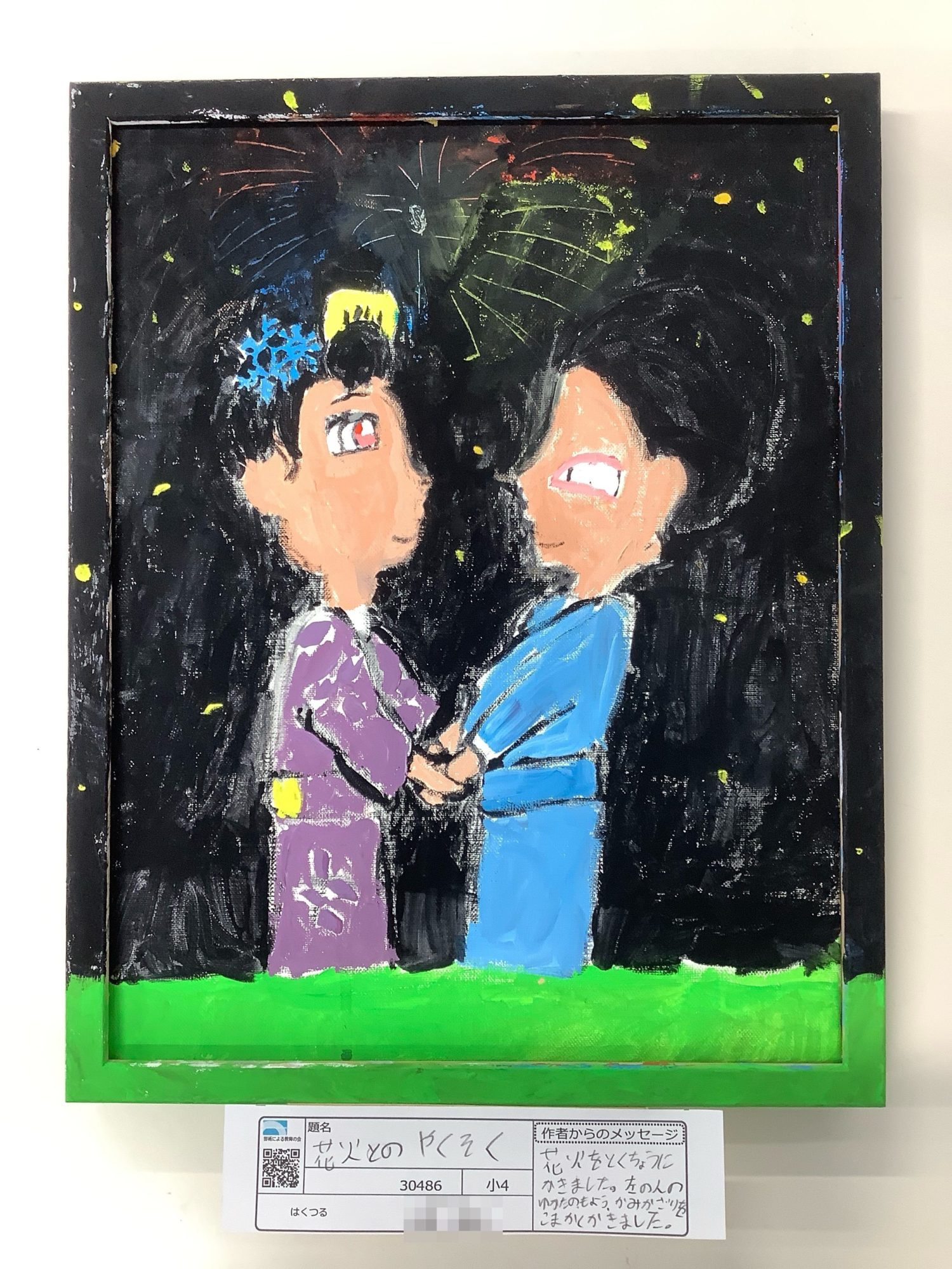 夜空いっぱいに広がる花火と、黒い背景の中で向き合う二人の姿が、画面の中央に大切に置かれています。着物の色のちがいや、手と手のつながりが、静かな時間の流れを感じさせます🎆🌙