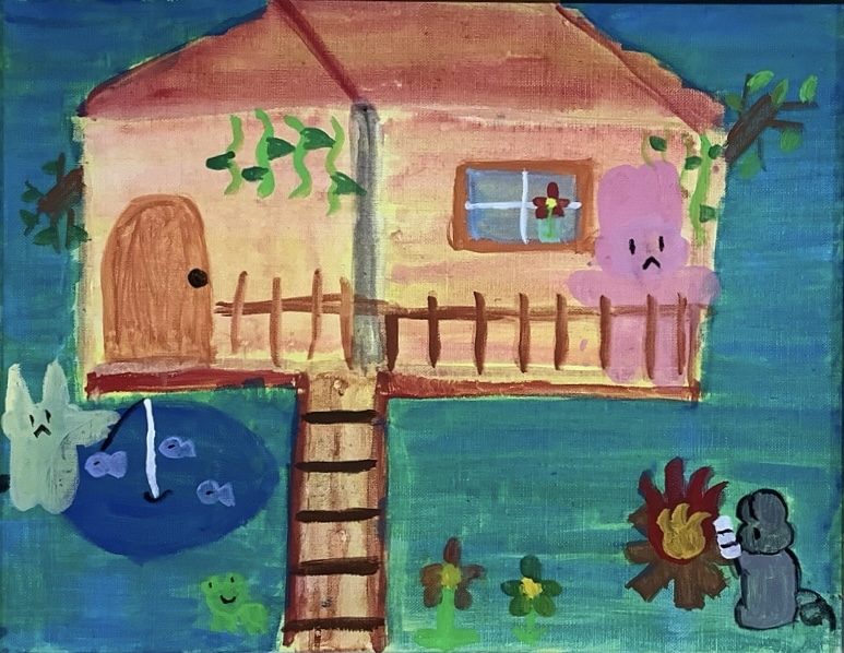 画面の真ん中に大きくツリーハウスが描かれていて、はしごや手すり、水の中の魚、火を囲む動物たちまで、たくさんの場面が一枚の中に丁寧に入っています。家の中と外、上と下がはっきり分かれていて、見ているだけで探検している気持ちになります🌳✨
