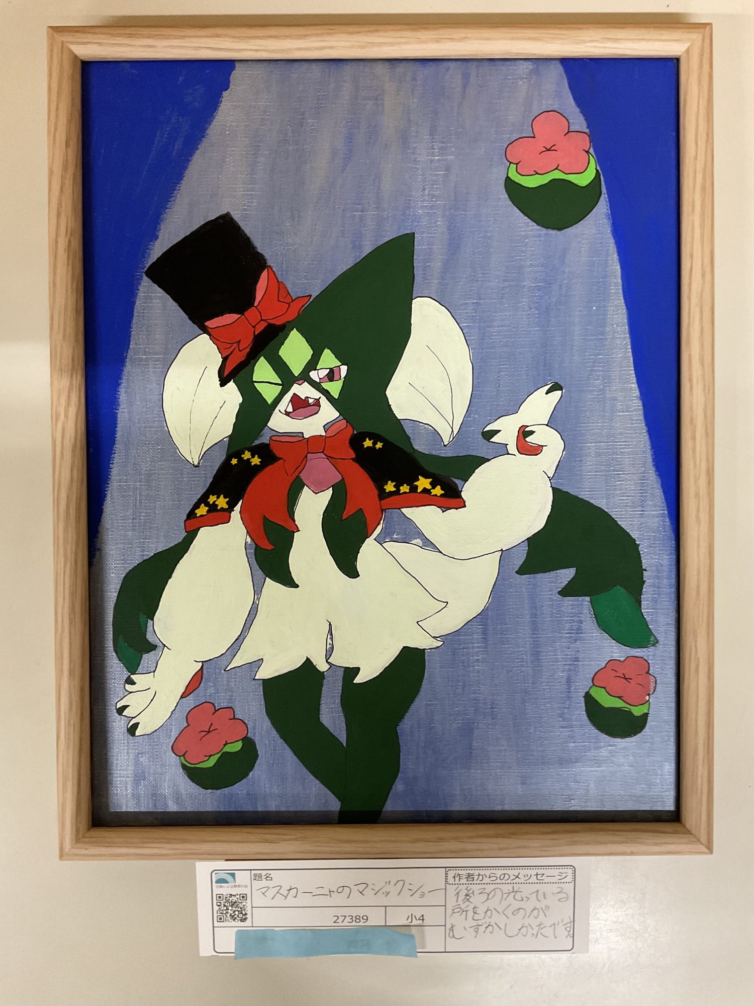 わかめせんせい 先生2026年1月2日 12:25 PM rinさん、 画面の中央に立つマスカーニャのポーズが、とても堂々としていて、まさにショーの始まりを感じさせます。 帽子やマント、リボンの形がはっきりしていて、色も整理されているので、キャラクターのかっこよさがまっすぐ伝わってきます🎩✨ 背景をすっきりさせていることで、体の動きや手のしぐさがより目立ち、「今まさに魔法をかけている瞬間」だと感じました。 作者からのコメントにあるように、後ろから花が出てくる仕かけを考えた発想も、とても楽しいですね🌸 私は、この絵を見て、静かな舞台にスポットライトが当たったようなワクワクを感じました。 一枚の絵で、ショーの物語を想像させる力が育っています🌟 もし次のマジックを描くとしたら、どんな魔法が飛び出してきそうですか?🪄 ログインして返信する ↓