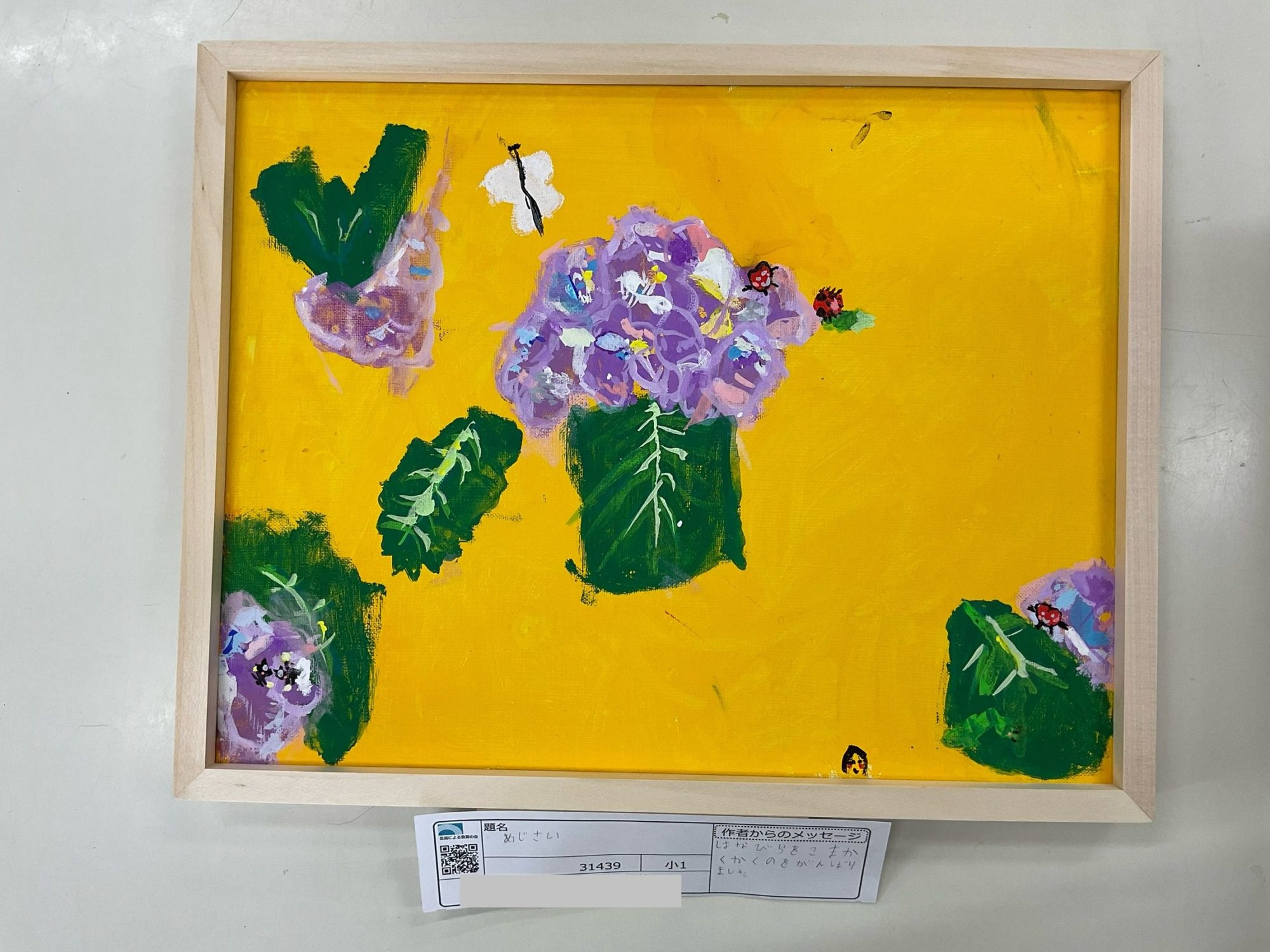 わかめせんせい 先生2026年1月2日 2:08 PM ことねさん、 明るい黄色の画面に、紫のあじさいがふわっと浮かぶように配置されていて、まず色の対比がとても印象に残りました。 葉の緑も一つひとつ形や向きが違い、風や空間の広がりを感じさせてくれます🌿✨ 絵の具を重ねた花の部分からは、ぽこぽこと咲いている感じや、さわったときのやわらかさまで伝わってくるようでした。 小さな虫や人の姿がそっと入っているところに、ことねさんの「見つける目」が表れていると私は感じました🐞😊 このあじさいを描いているとき、ことねさんはどんな場所や気持ちを思い浮かべていましたか?🌼 ログインして返信する ↓