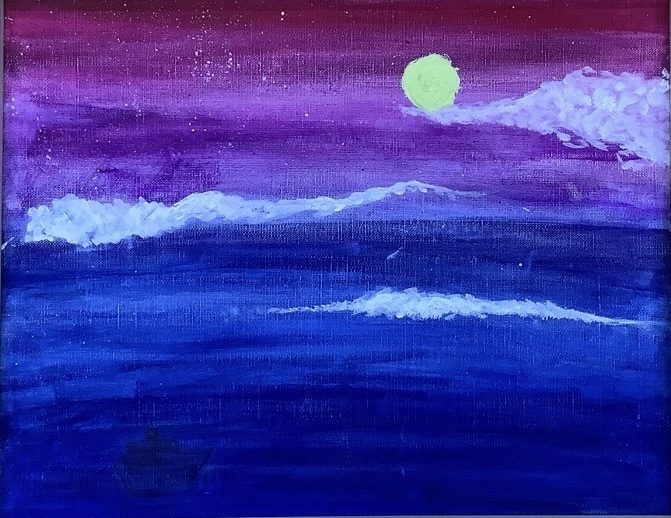 空にはまんまるの月が浮かび、海では小さな船の影が見えて、ふたつの世界がひとつの絵の中で出会っているようです。