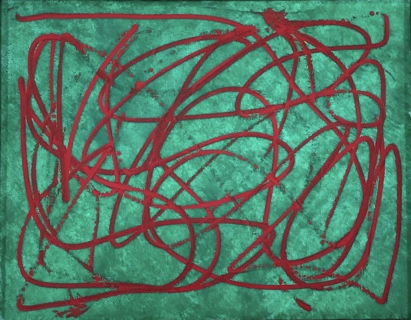 みどり色の画面いっぱいに、赤い毛糸の線が何本も重なり合いながら広がっていますね🧶