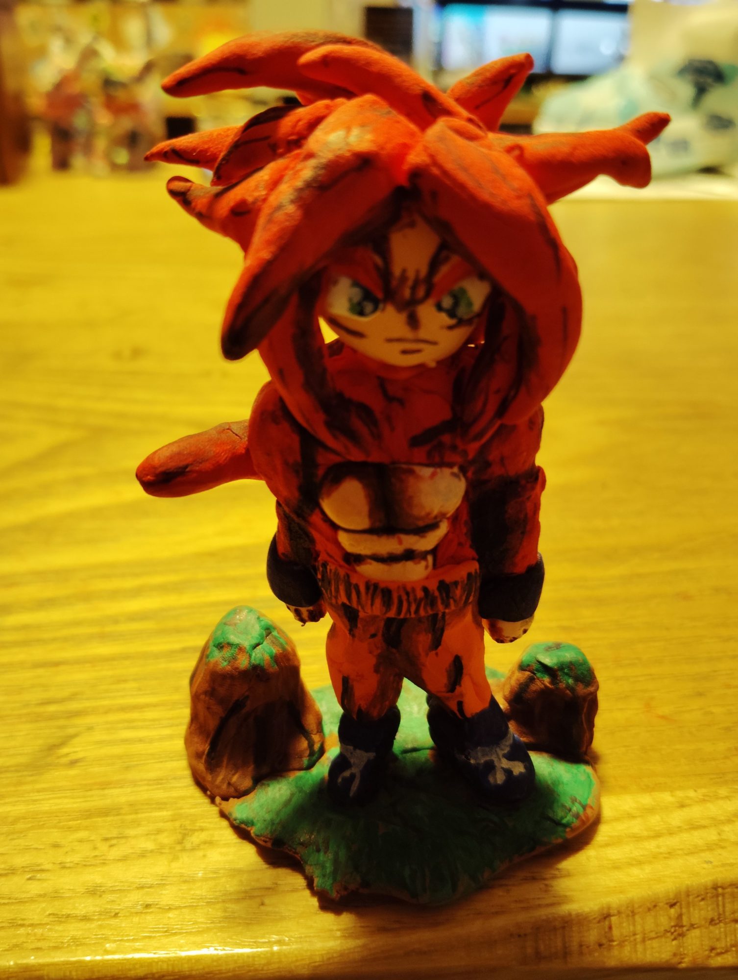 ペンで描いた影もとても効果的。粘土の立体に線が加わることで筋肉の盛り上がりや髪の束感がはっきりして、まるでアニメから飛び出してきたような迫力になっています。尻尾や髪の毛の造形は難しかったと思いますが、その“難しさ”に真正面から挑んだ跡がしっかり残っていて、とても頼もしいです。