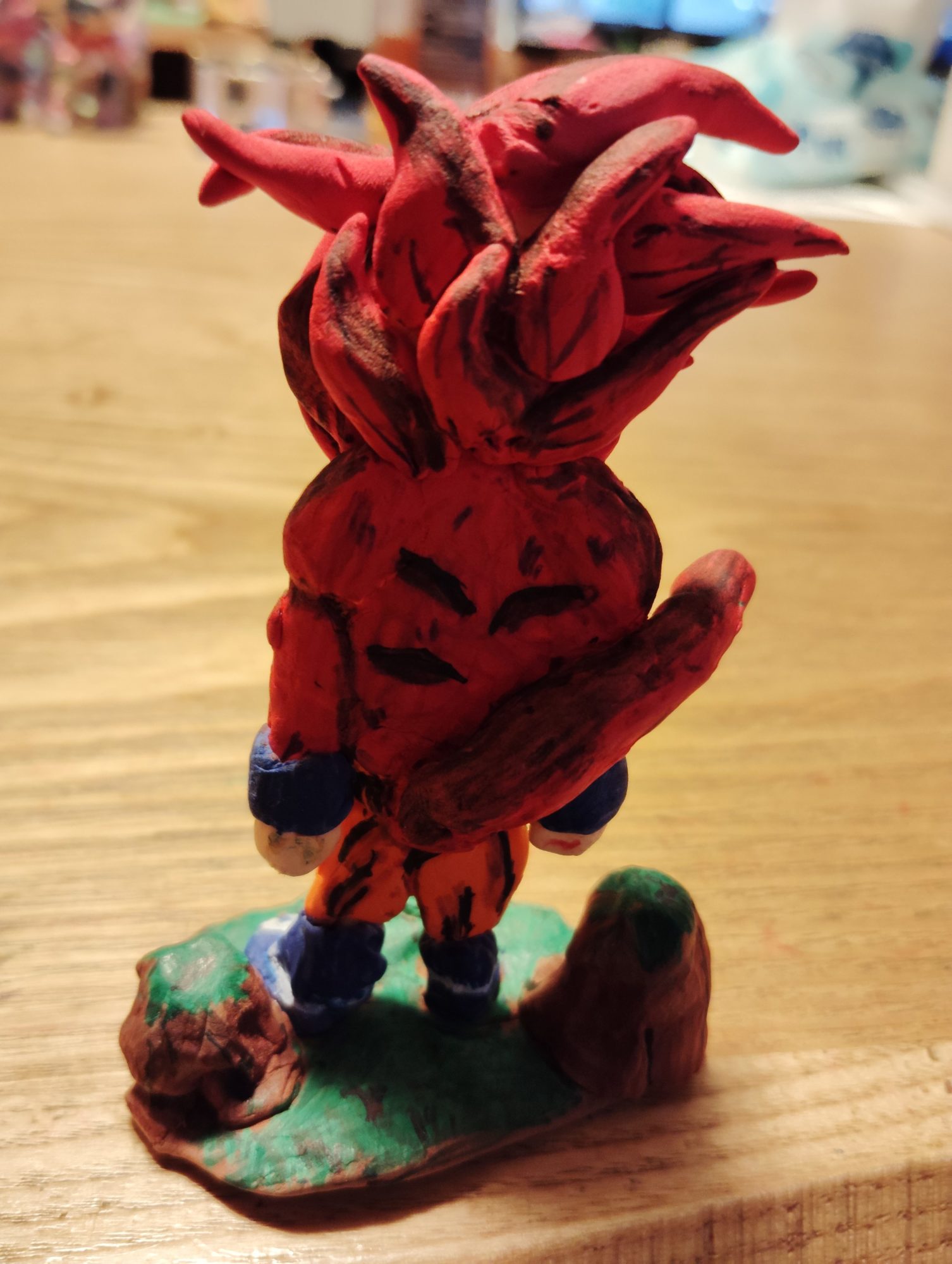 スーパーサイヤ人4悟空の立体作品、とても力強くて見ごたえがありますね。まず目を引くのは、全身からあふれるような“気”の表現。赤く逆立つ髪の毛は一本一本がしっかり形づくられていて、戦闘力がぐっと高まっている瞬間を立体でとらえています。後ろ姿まで丁寧につくってあるので、ぐるっと回して見たくなる楽しさがありますね。