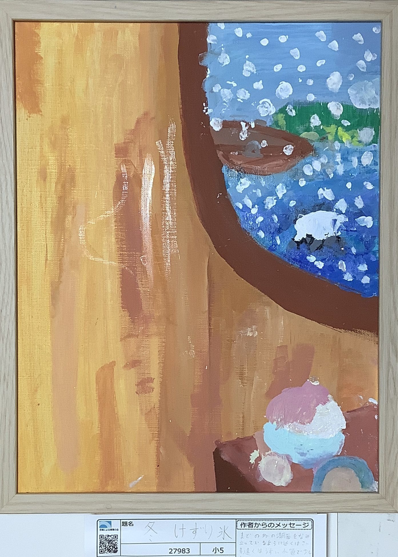 わかめせんせい 先生2026年1月4日 11:59 AM kanei さん 右下のけずり氷は、やさしい色が重なり、冷たさとおいしそうな感じが同時に伝わってきました🍧✨ 丸い窓の外にはさまざまな青の世界が広がっており、 メッセージで書いてくれたように、湖の奥行きを大切に描いたことが感じられます。 外の景色にも、けずり氷のひんやりした空気がつながっているようですね❄️ 私は、この絵を見て、景色をながめながら、ほっと一息つく冬の時間を思い出しました。 このけずり氷はどんな味がするのかな? ログインして返信する ↓
