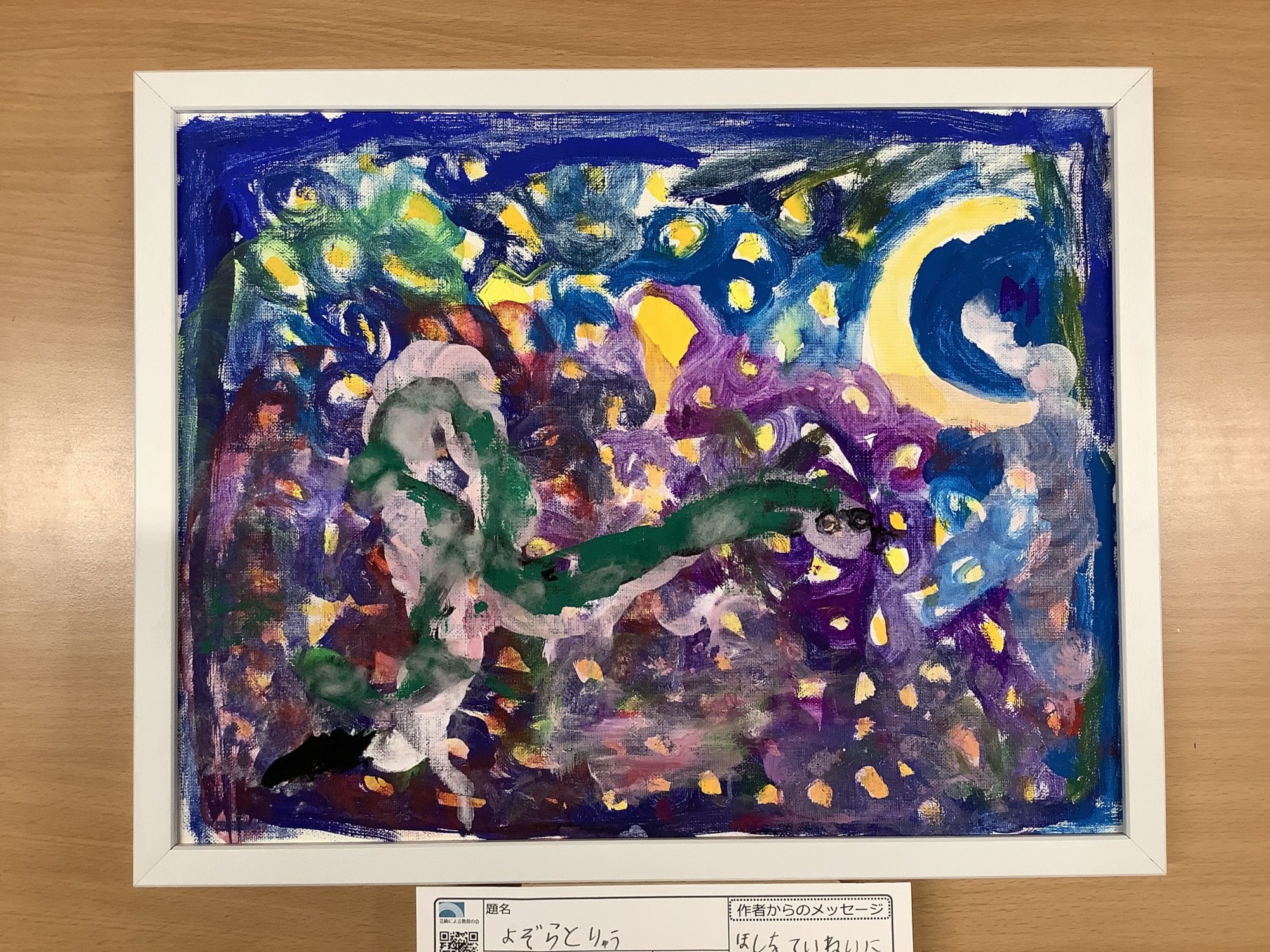 私は、この絵から、強さとやさしさがまざった夜の物語を感じました。りゅうの形が少しあいまいなところが、想像の世界を広げてくれて、とても楽しいです。思いついたイメージをそのまま絵にした勇気もすてきだと思いました。