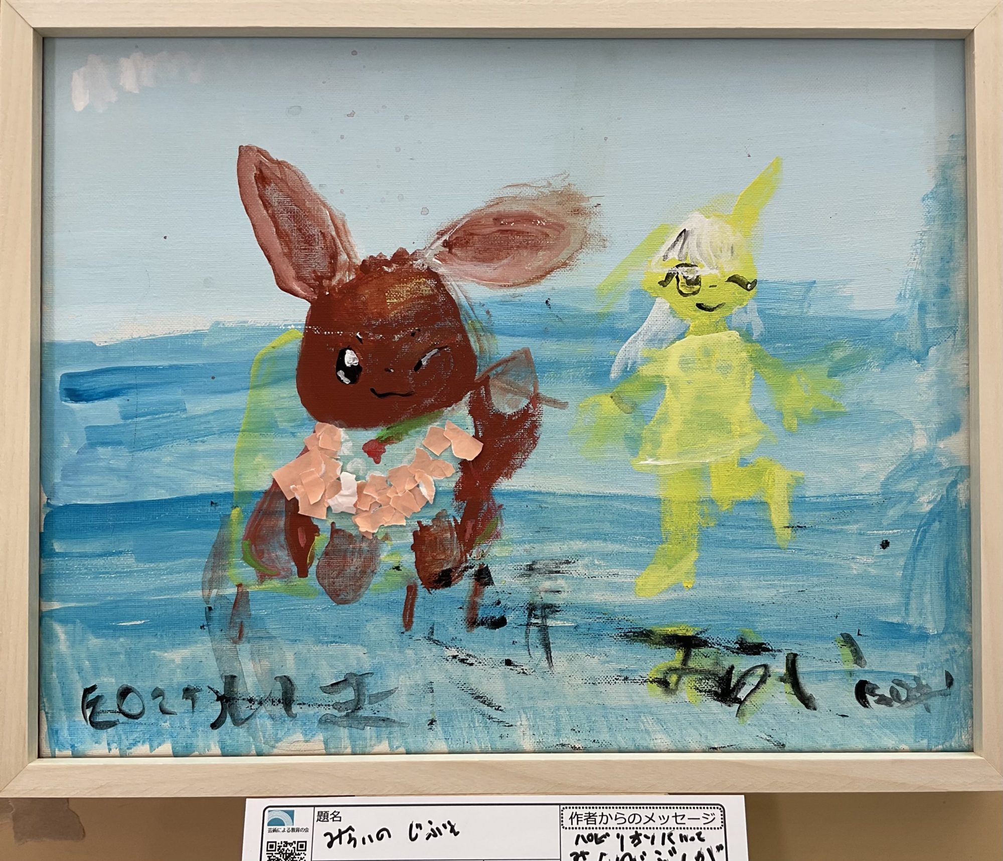 青い背景の中に、うさぎのような存在と、光をまとった人の姿が並んでいて、画面全体がとても自由でのびのびしています。絵の具の重なりや、貼られた素材のざらっとした感じから、思いついたことをそのまま形にしていった様子が伝わってきました🎨✨
