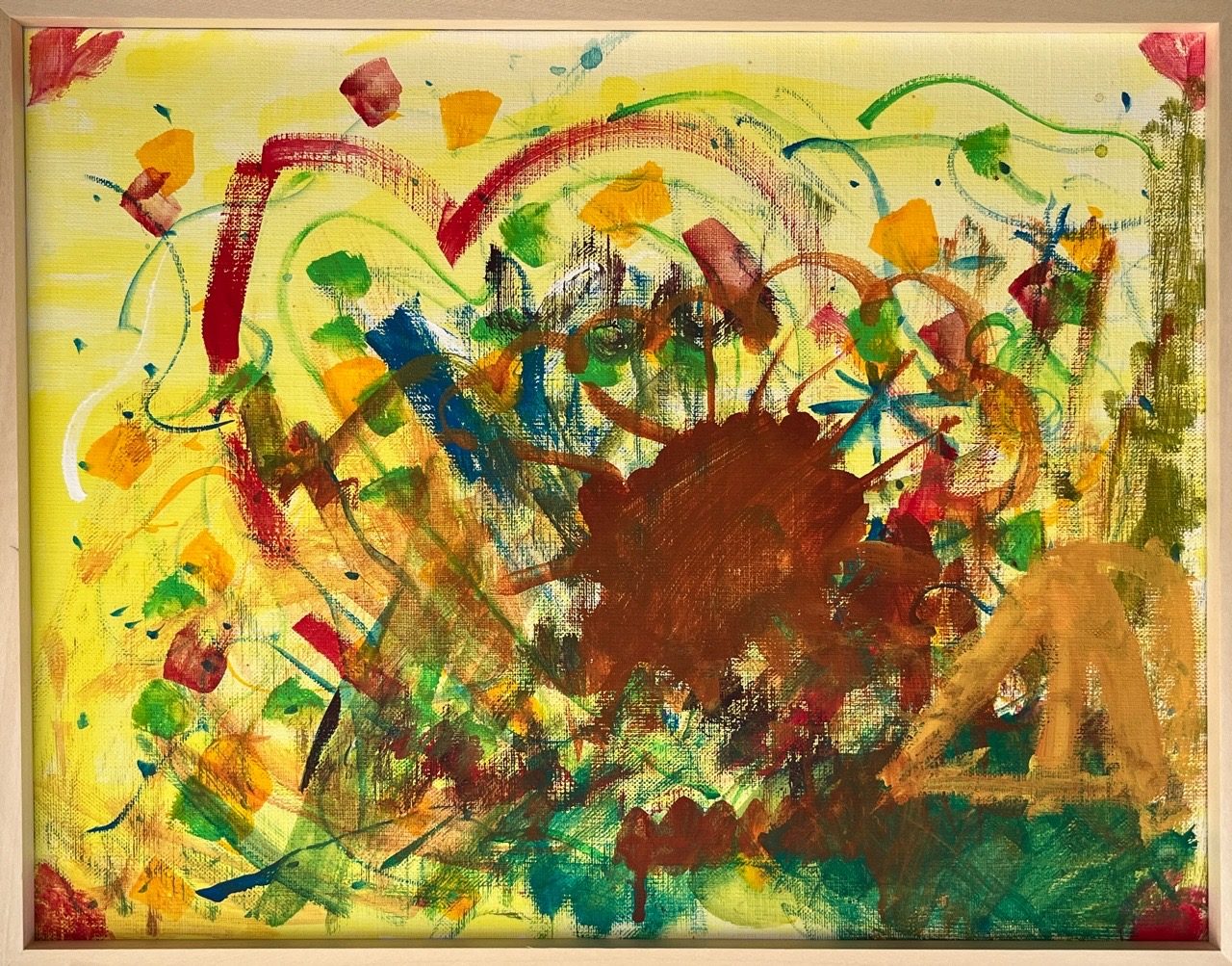 わかめせんせい 先生2026年1月14日 3:58 PM あかりさん、 画面いっぱいに広がる色と動きから、にぎやかであたたかい「ふゆのまち」の空気が伝わってきます。黄色をベースに、赤や緑、青が重なり合って、寒い季節なのに心がぽっと明るくなるようですね。 とくにがんばったというハートのところは、線や色が何度も重なっていて、気持ちを強く込めた様子がよく分かります。形が少し崩れているのも、まちの音や人の気配が動いている感じにつながっていて、とてもおもしろいです。 このまちは、どんな人たちが住んでいて、どんな冬の一日を過ごしているのかな? ログインして返信する ↓