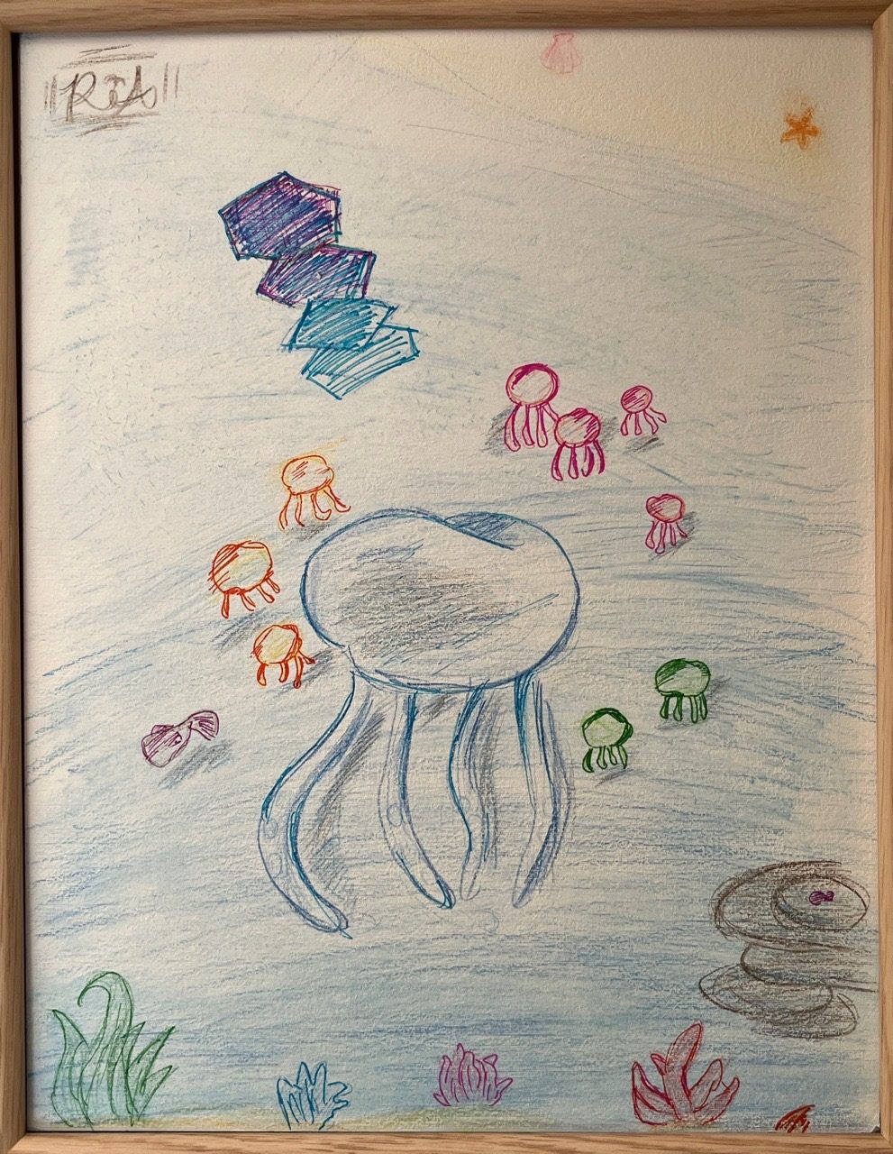 やさしい水色の海の中に、大きなクラゲがゆったりと浮かび、そのまわりを色とりどりの生きものたちが取り囲んでいます。一本一本ていねいに描かれた線や、場所ごとに変わる色から、海の中の広さやにぎわいが自然と伝わってきました。🐙🌊