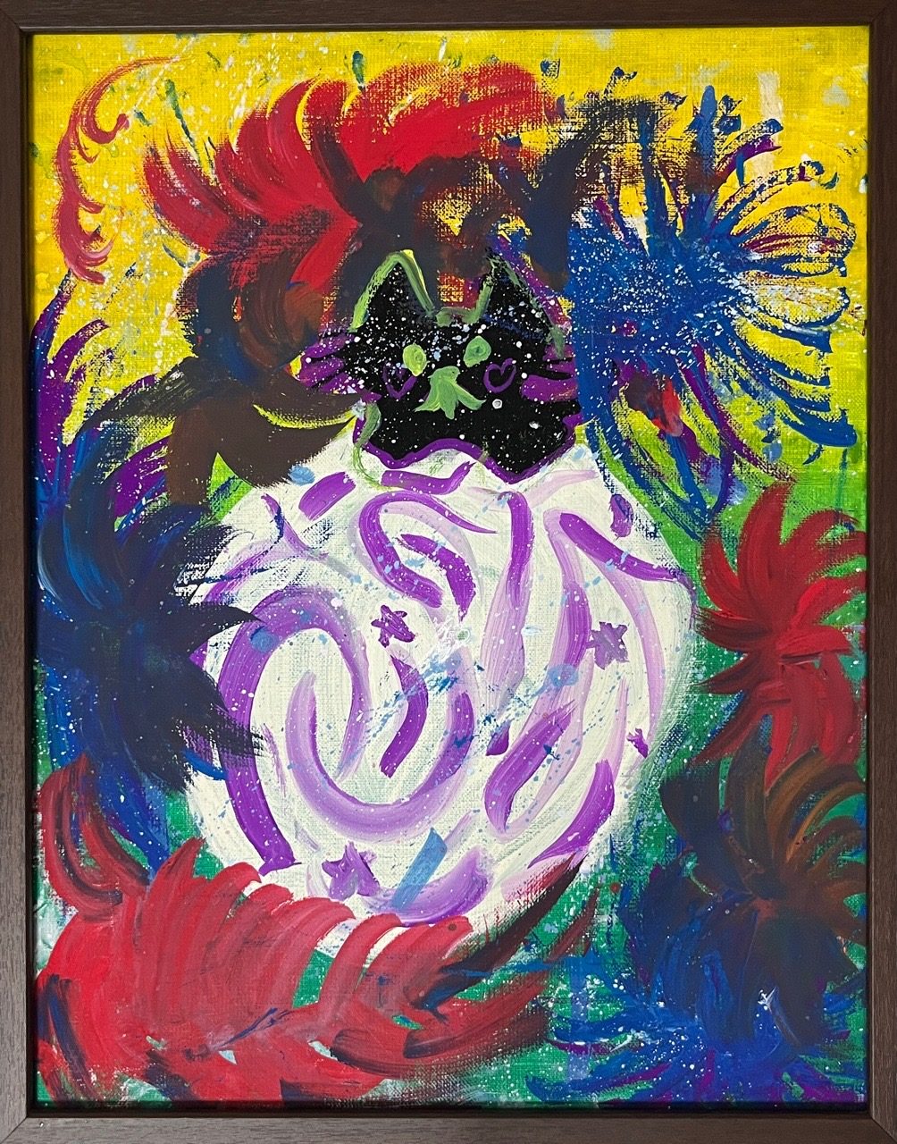 真ん中の月は、やさしい白と紫の線で包まれていて、まわりの激しい色との対比がとても印象的です。その中に描かれた黒ねこは、小さくても存在感があり、宇宙の中で静かにこちらを見ているように感じました。🐈⬛🌙