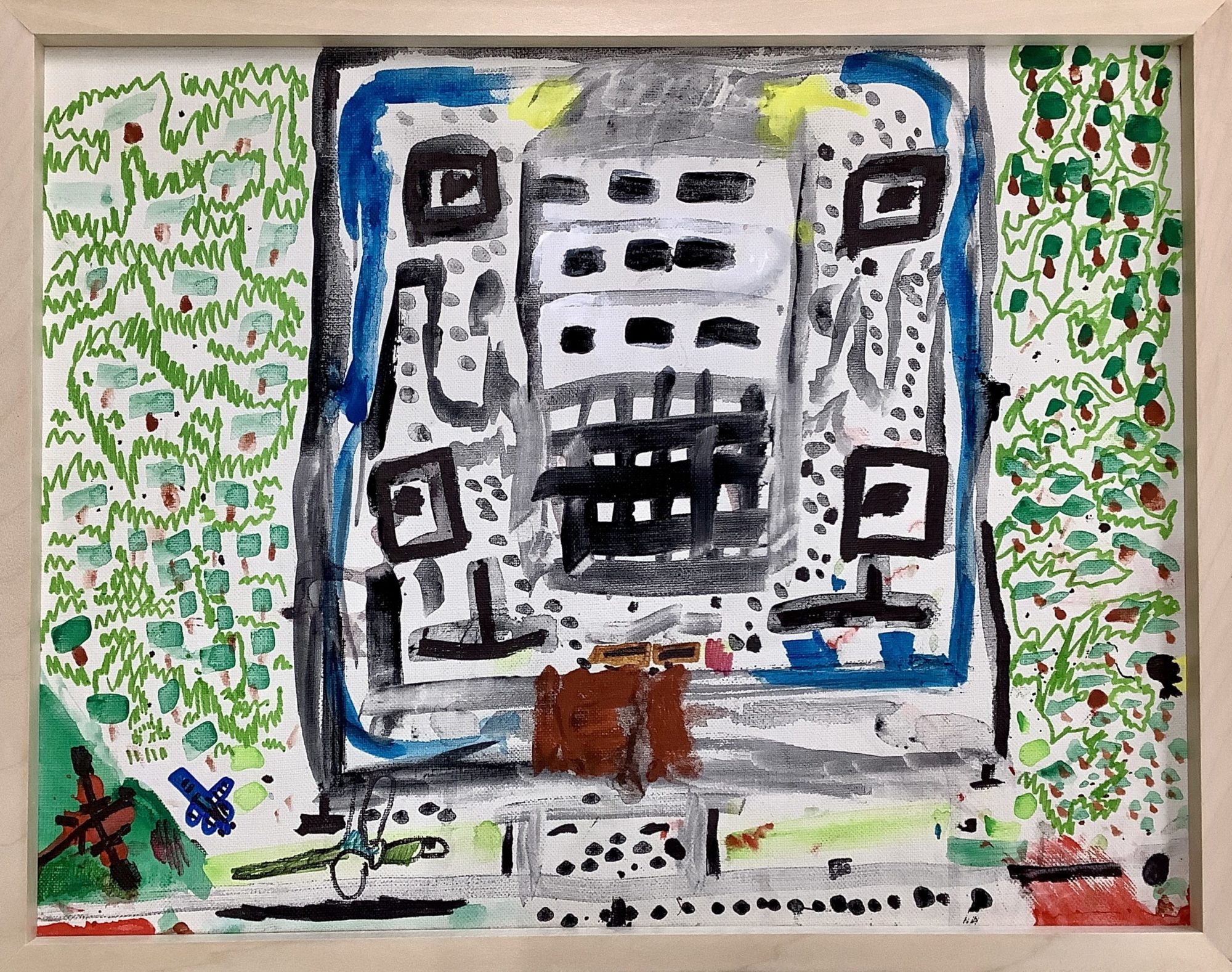 まんなかの建物は、四角や点、線が重なってできていて、石のかたさや長い歴史を感じさせますね。黒やグレーの使い分けも、影や奥行きを生み出していて、とても効果的です。