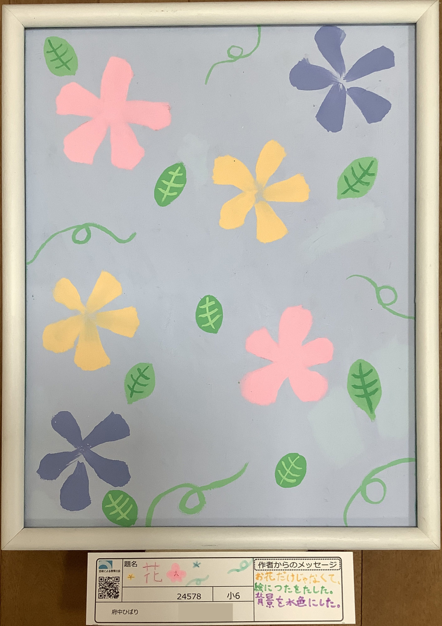 やわらかな水色の背景に、ピンクや黄色、むらさきの花が、間をあけて気持ちよく並んでいます。花びらの形が少しずつちがい、同じモチーフでも一つひとつに表情があるところに、ていねいなまなざしを感じました。葉っぱの緑も、形や線が工夫されていて、画面の中にリズムが生まれています。
