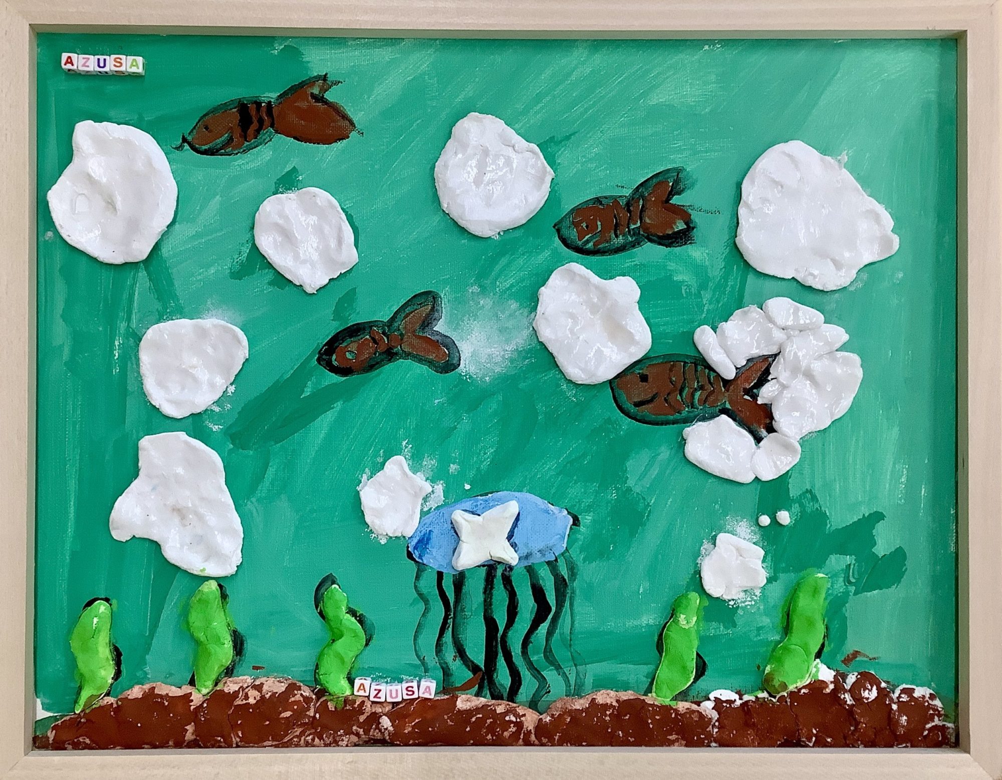 白いふわふわとした素材を使い、泡や波しぶきを立体的に表現している工夫に、私はあーちゃんの豊かな発想力を発見して驚きました。画面から今にも水のはじける音が聞こえてきそうです。