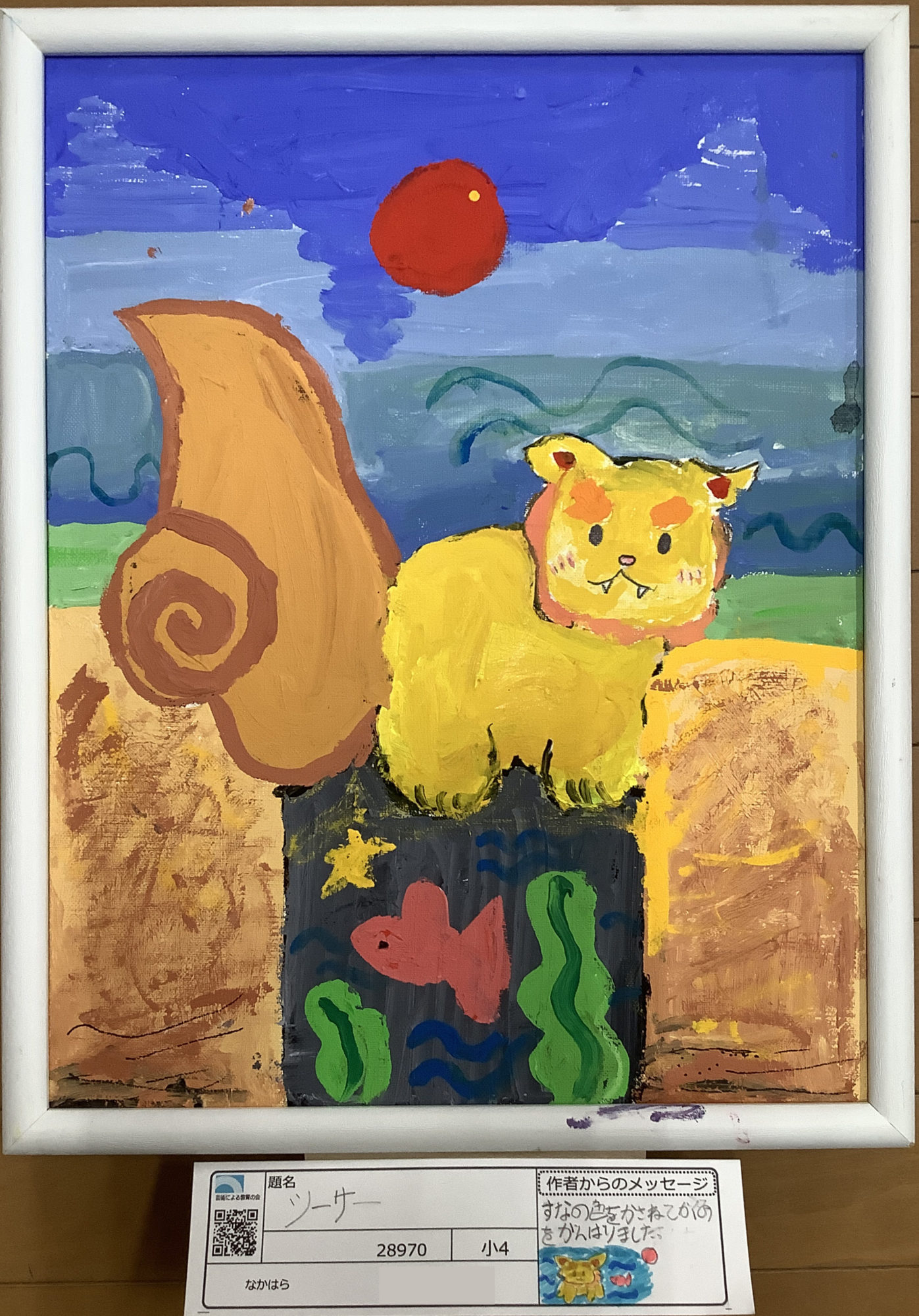 題名カードの「すなの色をかさねてぬるのをがんばりました」という言葉通り、足元の砂浜の表現にとても深みがあります。