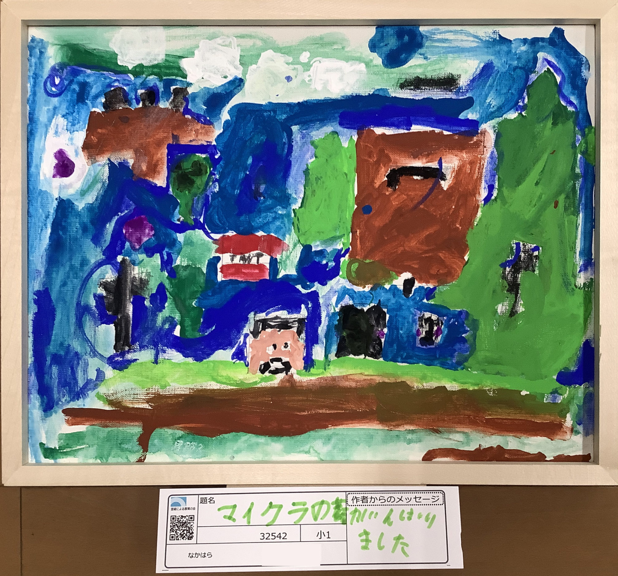 題名カードの「がんばりました」という言葉通り、画用紙のすみずみまで一生懸命に色をのせた努力が、作品の大きなエネルギーになっていますね。私は、この絵を見ていると一緒に探検しているような、とても楽しい気持ちになりました。✨
