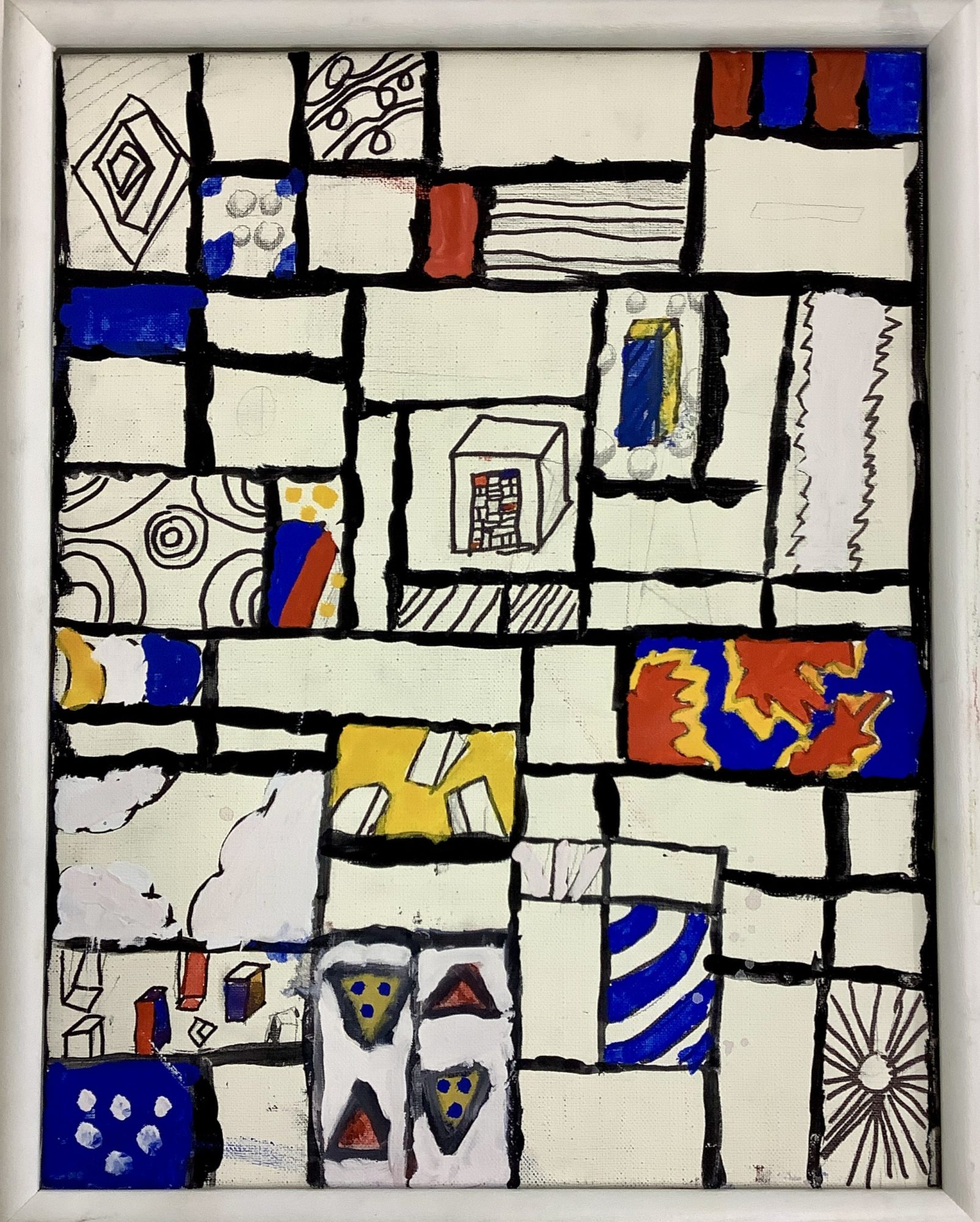 黒い線で区切られたたくさんの四角の中に、丸やギザギザ、階段のような不思議な模様がぎゅっと詰まっていますね。青や黄色の鮮やかな色がリズムよく配置されていて、一つひとつが独立した小さな宇宙のようです。🎨