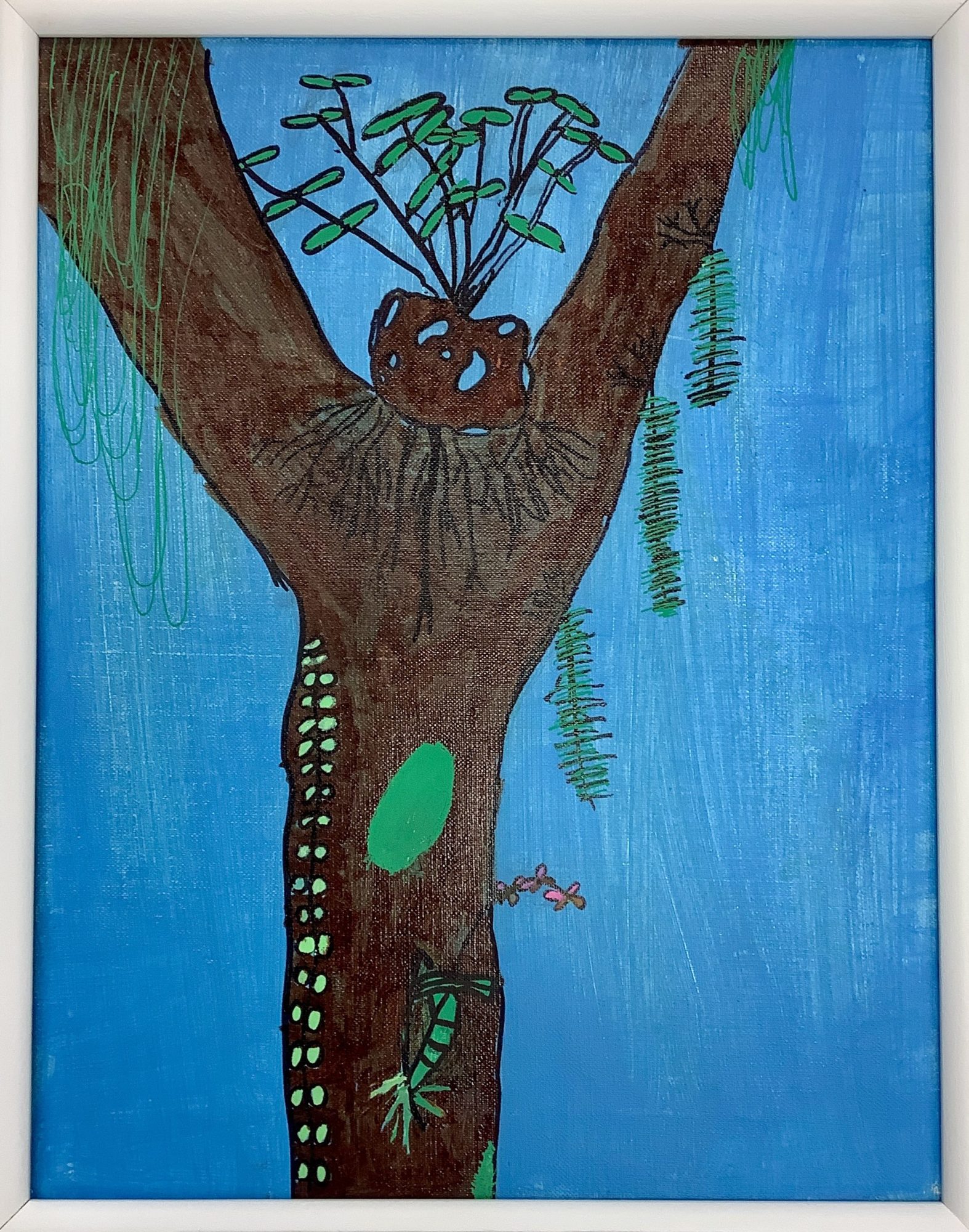 私は、幹に描かれた小さな緑の点々や、右側に垂れ下がるシダのような植物の細やかな描写を発見して、この木がたくさんの命を育む魔法の場所のように感じてワクワクしました。ジャガイモから力強く伸びる緑の葉っぱも、生命力にあふれていて素晴らしいです。✨