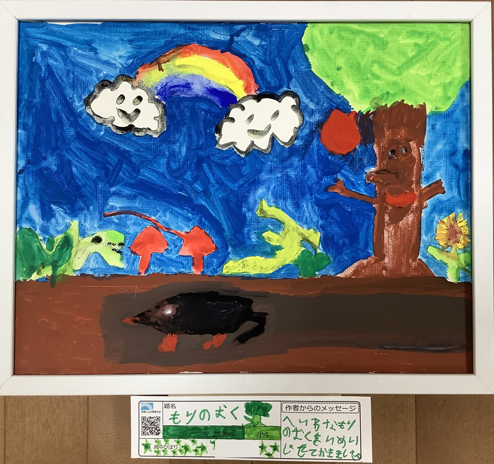 題名カードに書かれた「へいわなもりの おくを いめーじして かきました」という言葉の通り、どこを見ても優しさがあふれる世界です。空のダイナミックな筆使いと、小さな草花やキノコを丁寧に描き分けた繊細な表現から、kiyoさんがこの森の空気感を大切にしようとした情熱が真っ直ぐに伝わってきました。✨