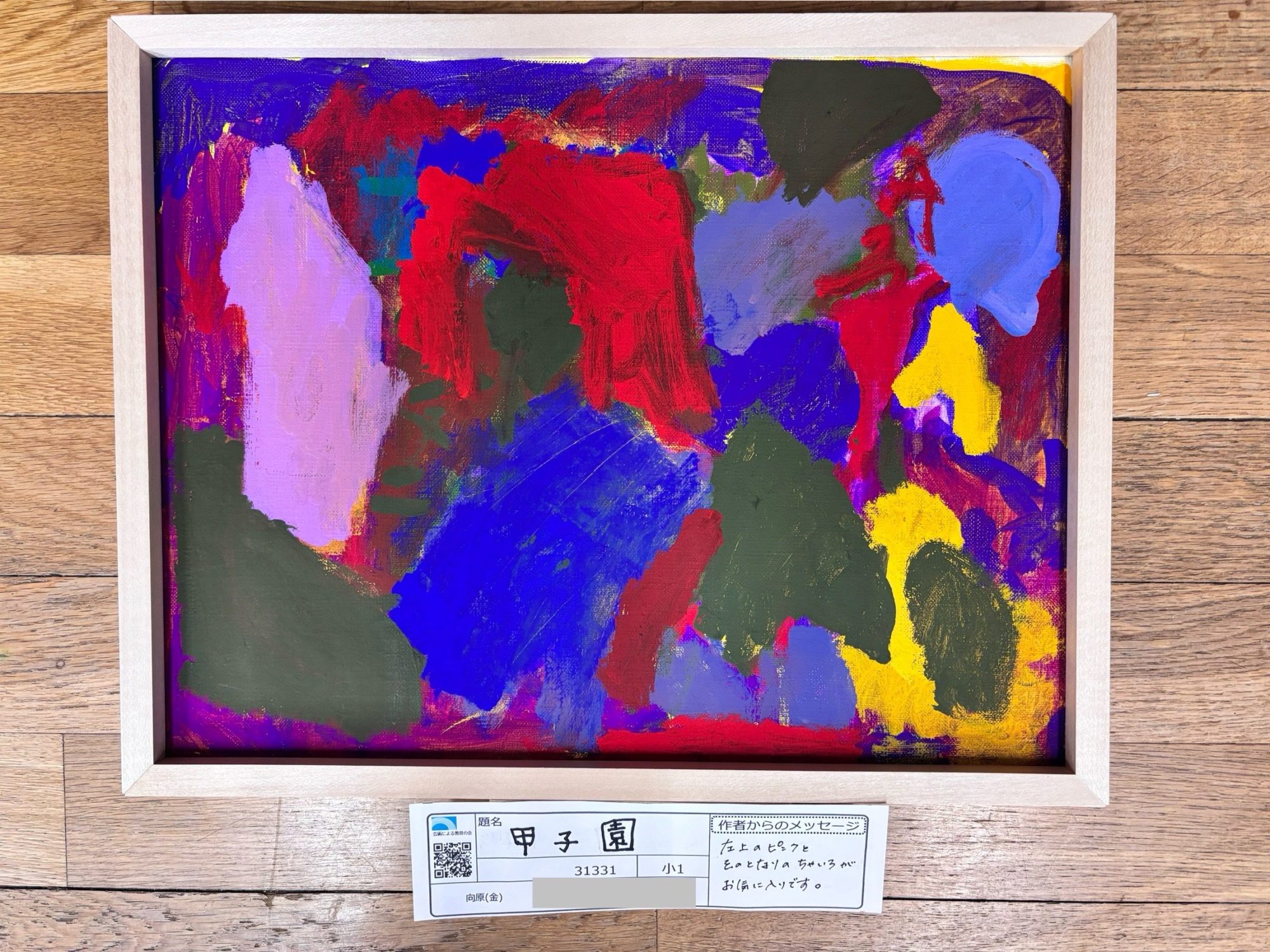 題名カードに「左上のピンクとそのとなりのちゃいろがお気に入りです」と書かれているのを見つけました。自分の「好き」という感覚を大切にしながら、一筆ずつ力強く筆を動かした-taiさんの真っ直ぐな表現力を私は発見しました。