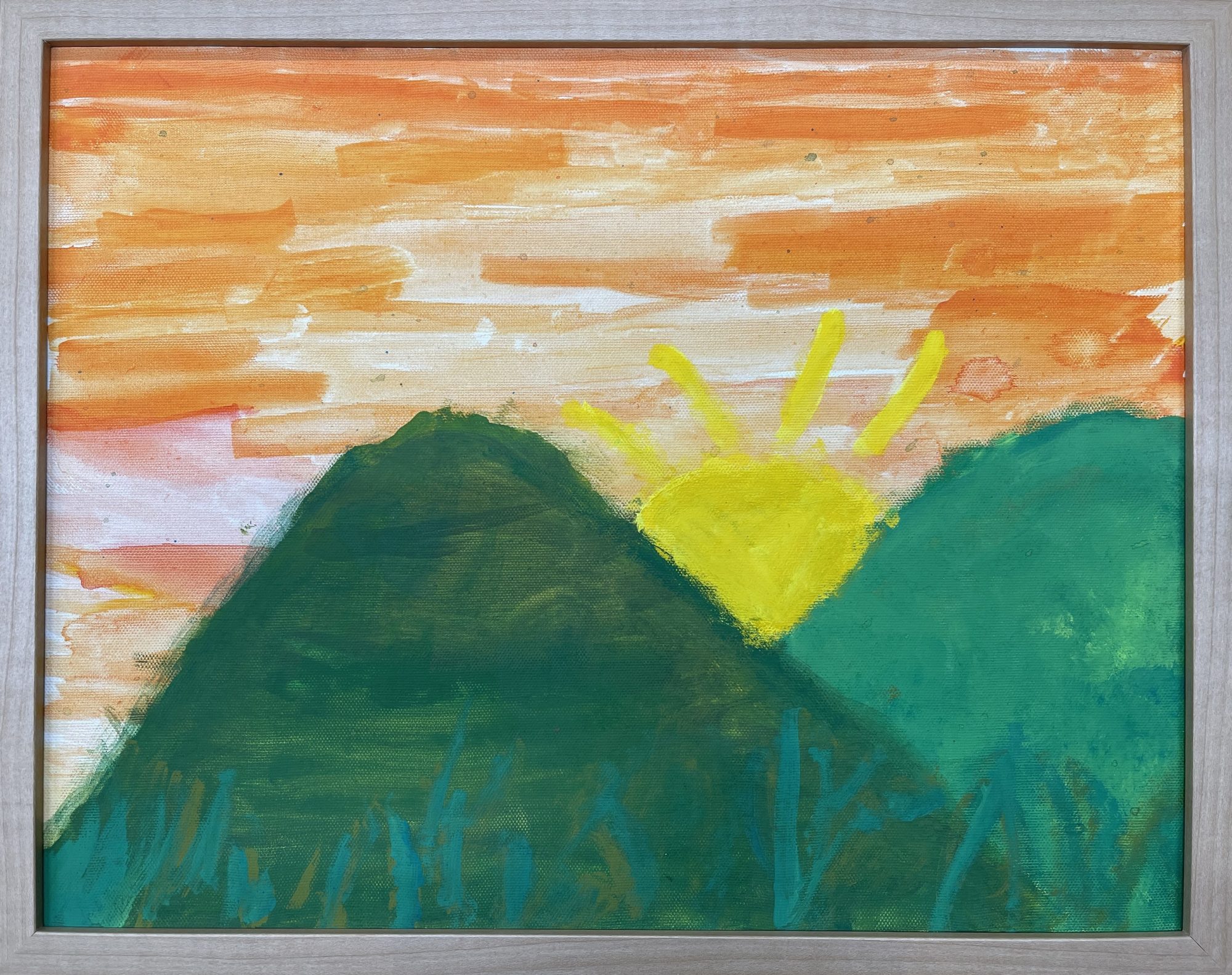 わかめせんせい 先生2026年1月15日 1:54 PM miyabi1114さん、 山のあいだから、ゆっくりと夕日がしずんでいく時間が、 この一枚の中に、ちゃんと感じられます🌄 空のオレンジと白がまざり合っているところ、 「もうすぐ夜になるよ」という空の声みたいですね。 山の形も、かっちり描こうとせず、 大きなかたまりとしてのびのび塗っているのがとてもいいです。 だからこそ、夕日の黄色が、 山のすきまから「ぱっ」と光って見えるんだと思います☀️ 下のほうに入っている青や緑の線も、 草や風、山の息づかいみたいで、 見ていると、その場所に立っている気分になります。 もしこの山で、 もう少し時間がたったら、 空の色はどう変わると思いますか? つぎは、どんな色の空を描いてみたいかな😊 ログインして返信する ↓