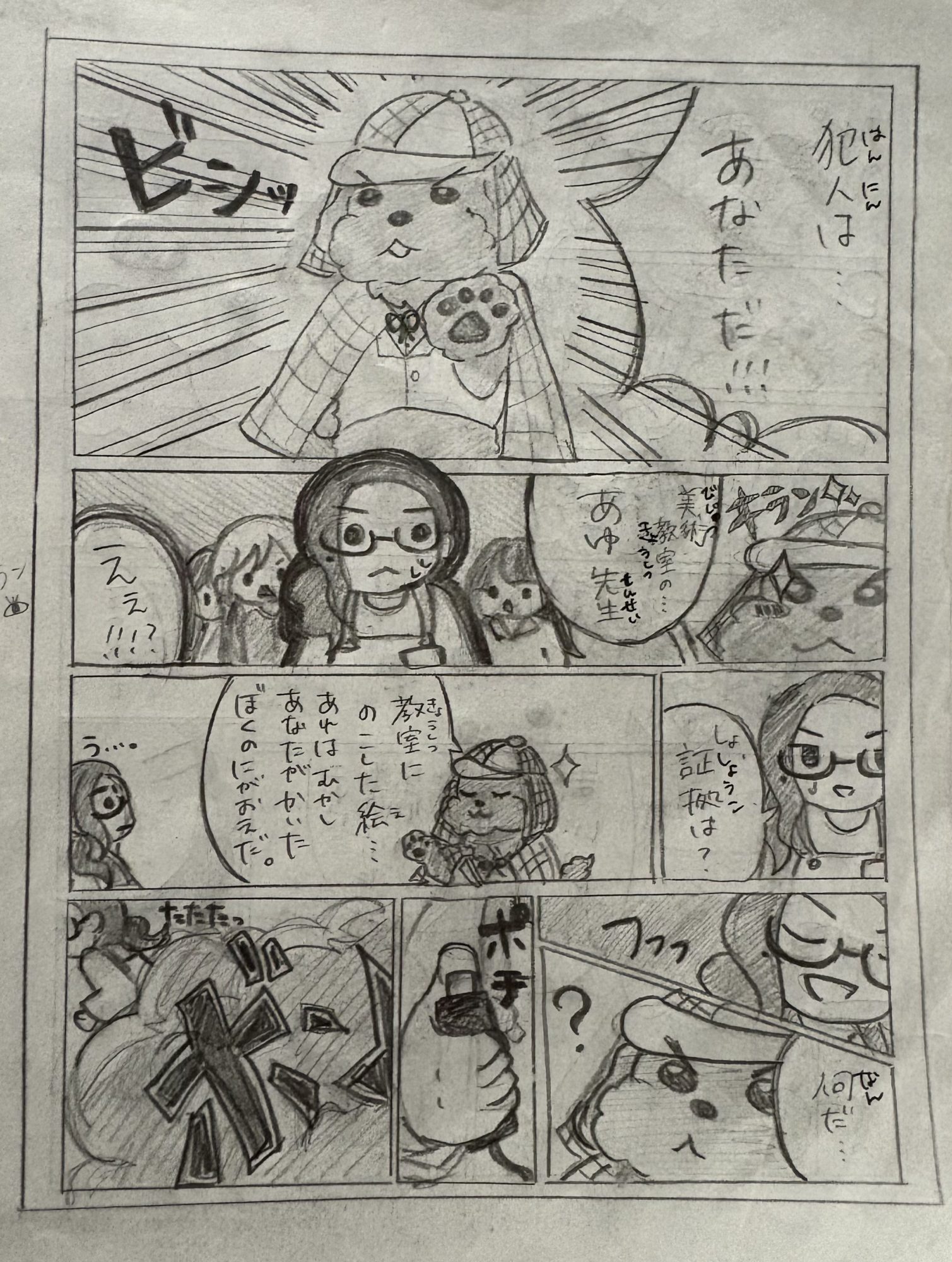 わかめせんせい 先生2025年12月15日 8:58 AM あゆ先生🍋、 名探偵犬エース🐾の漫画、とても完成度が高く、構成力のある作品だと感じました。 探偵役にエースを据え、自分自身を犯人に設定するという視点の転換がとても巧みで、物語としてのフックが最初からしっかり効いています。 「ばばーん!!」という効果的な演出や、場面の切り替えから、読者を楽しませることを意識したストーリーテリングが伝わってきました。 絵と文章のバランスもよく、無理なく物語世界に引き込まれます。 ミステリーというジャンルへの理解と愛情があるからこそ、展開に説得力があり、最後まで安心して読める構成になっていますね。 自分の「好き」を題材にしながら、それを他者に伝わる形へと整理し、作品として成立させている点は、表現者としての大きな強みだと思います。 今後も、物語性のある表現をぜひみせてください。 ログインして返信する ↓
