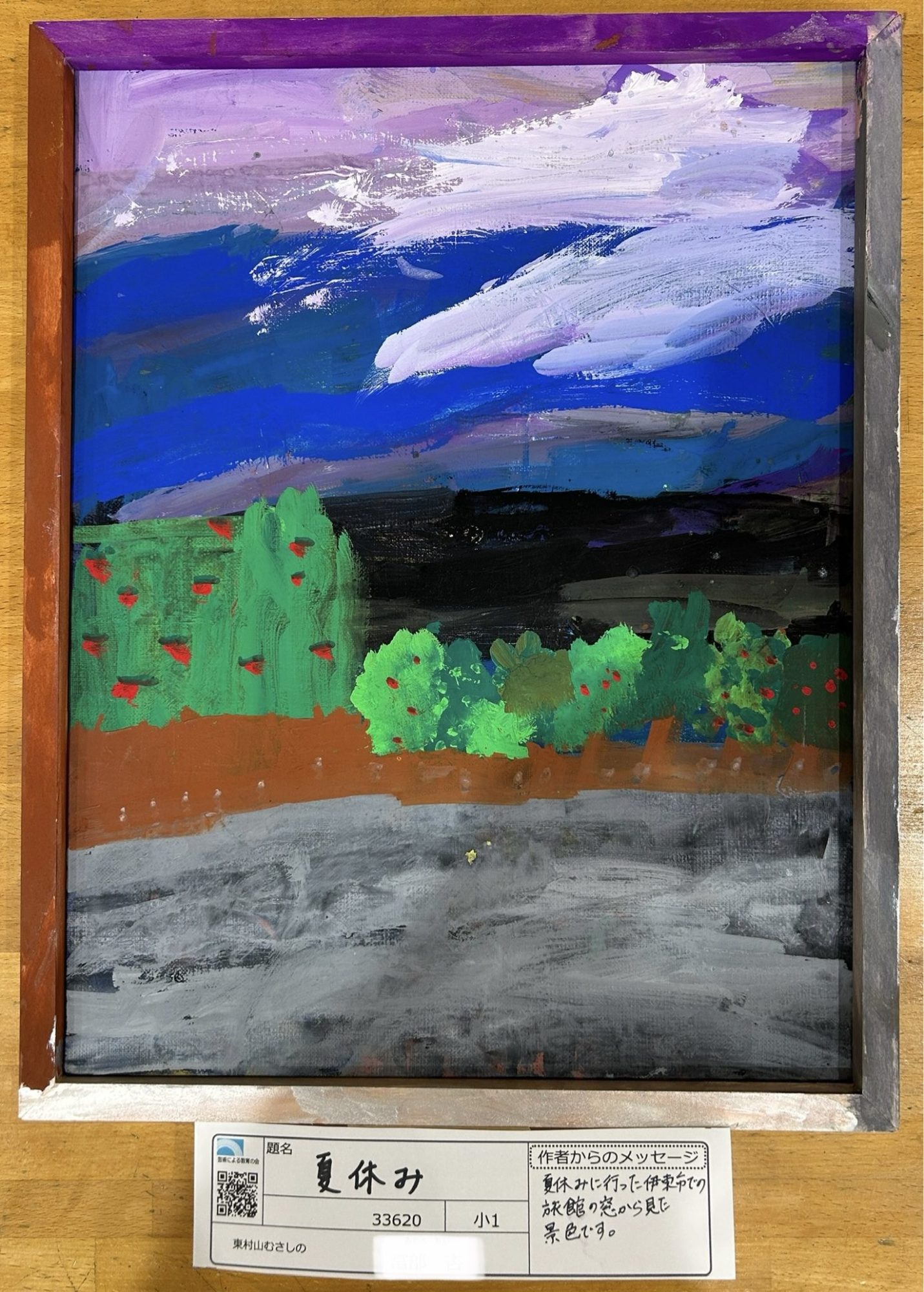 わかめせんせい 先生2026年1月17日 2:39 PM あんさんへ。 空の色がとても気持ちいいですね。青の上に重なる白やむらさきの筆あとが、ゆっくり流れる雲や、夏の空の奥行きを感じさせてくれます。空だけで「暑さ」や「時間の流れ」が伝わってくるのが、とても印象的です。 その下に広がる緑のかたまりも、よく見ると一つひとつ表情が違っていて、赤い点が入っているところから、実際に見た景色を思い出しながら描いている感じが伝わってきます。黒っぽい帯の部分が入ったことで、景色にぐっと重さと静けさが加わりましたね。 一番下の道や地面のグレーも、ただ塗っているのではなく、何度もこすったり重ねたりしていて、「そこに立って見ていた自分の場所」がちゃんとあります。 夏休みに見たこの景色、あんさんはどんな気持ちで眺めていたのかな? 楽しかった気分だったのか、それとも少し静かな時間だったのか、聞いてみたくなりました。 ログインして返信する ↓