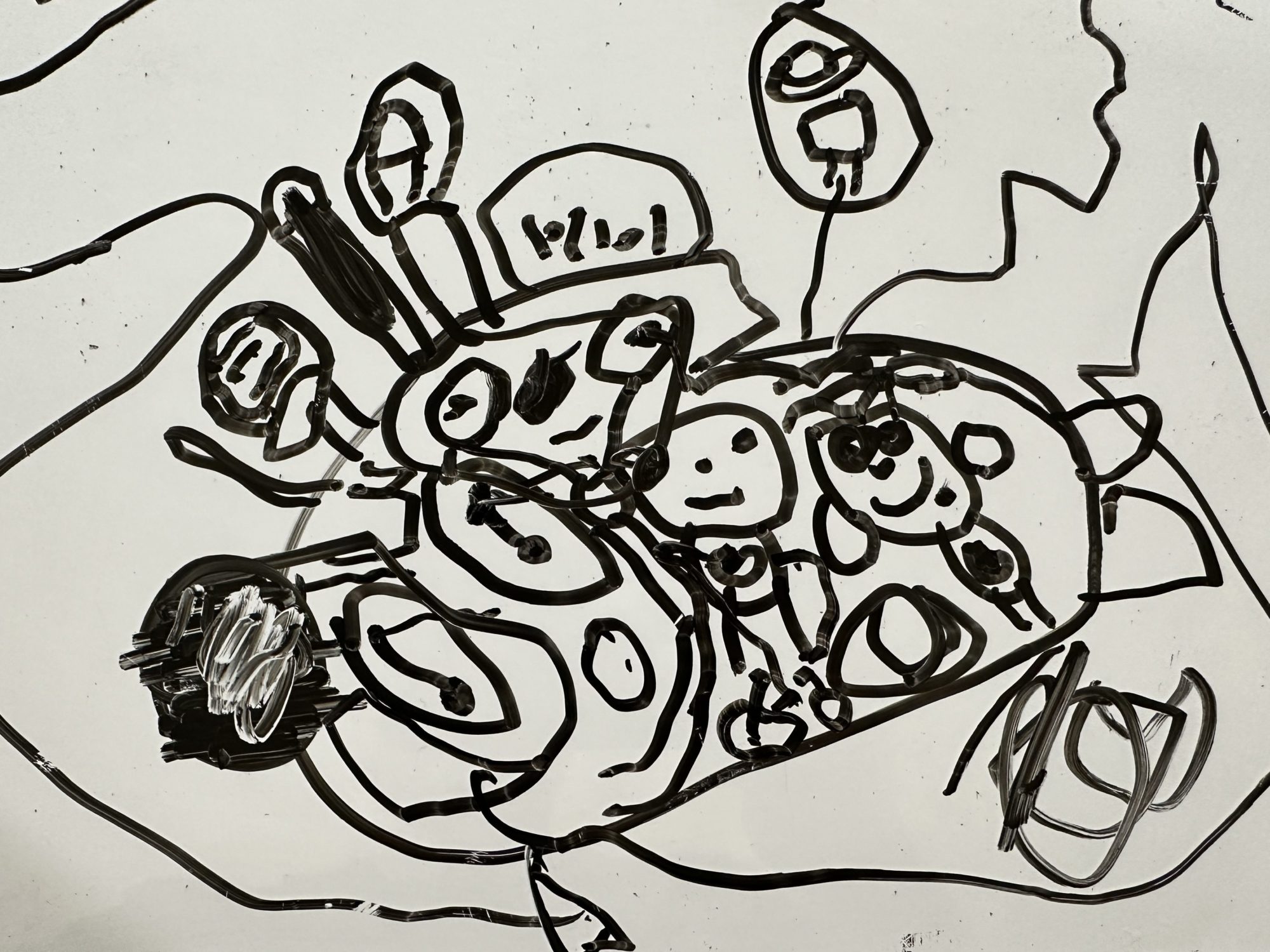 わかめせんせい 先生2025年12月19日 8:58 AM 太い線と細い線が混ざり合って、潜水艦の中の「ぎゅうぎゅう感」がとてもよく伝わってきます 🛥️ 顔や形が重なり合っているところを見ると、みんなが一つの空間に集まって、同じ方向を見ているようにも感じました。 ホワイトボードペンならではの、消せそうで消せない線の迷いも、そのまま動きや音になっているのがいいですね ✍️ 水の中を進むゴゴゴ…という感じや、機械が動く気配まで想像できます 🌊 この潜水艦は、今どこを探検しているところだと思いますか? ログインして返信する ↓