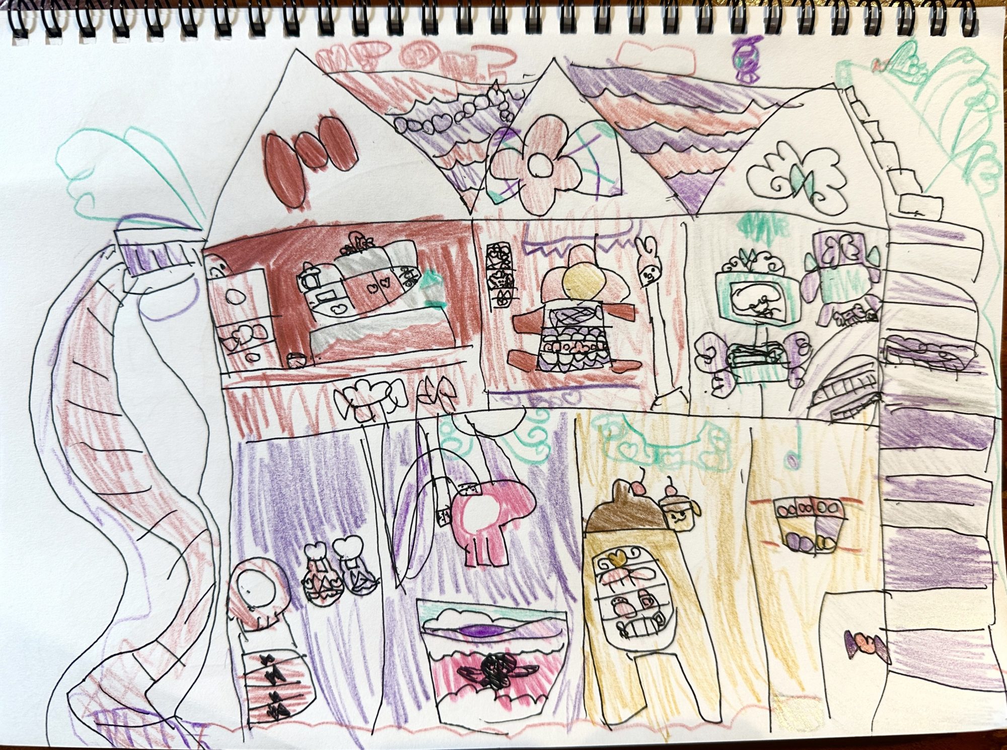 屋根のもようや、壁の色分け、家具の細かさまで、描きたい気持ちがあふれているのが伝わってきます 🎀