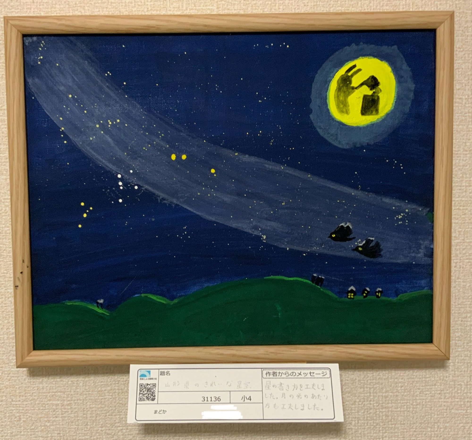 作者からのメッセージにあるように、星の描き方や、月の光のまわり方を工夫した気持ちがよく伝わってきました。見えない空気や距離まで、絵の中に表そうとしているところがすてきです。