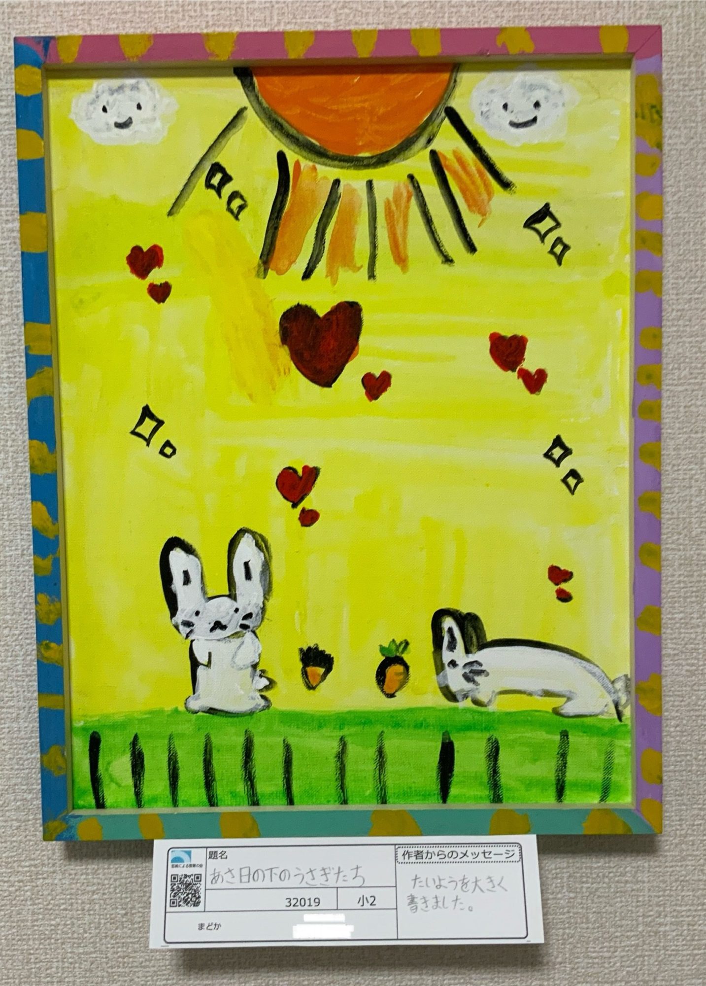 「たいようを大きく書きました」というメッセージから、あさ日の力づよさや、元気な感じを大切にしたことが伝わってきました。うさぎたちも、その光の中で安心してすごしているように見えます。