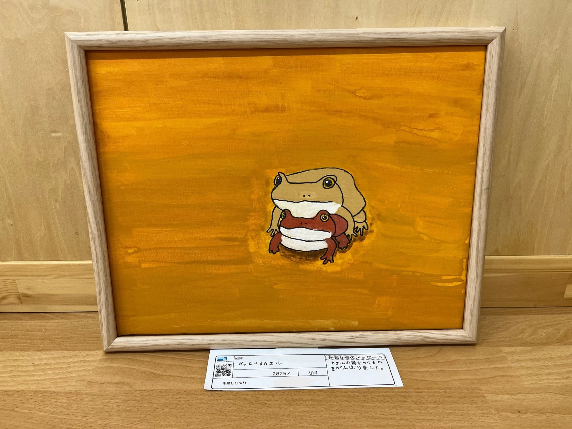 画面のまんなかに、カエルが二ひき、ぴたっと重なって立っていて、とても目をひかれました。まわりをぐるっと囲むオレンジ色は、ムラを残しながらぬられていて、空気やあたたかさが伝わってきます。