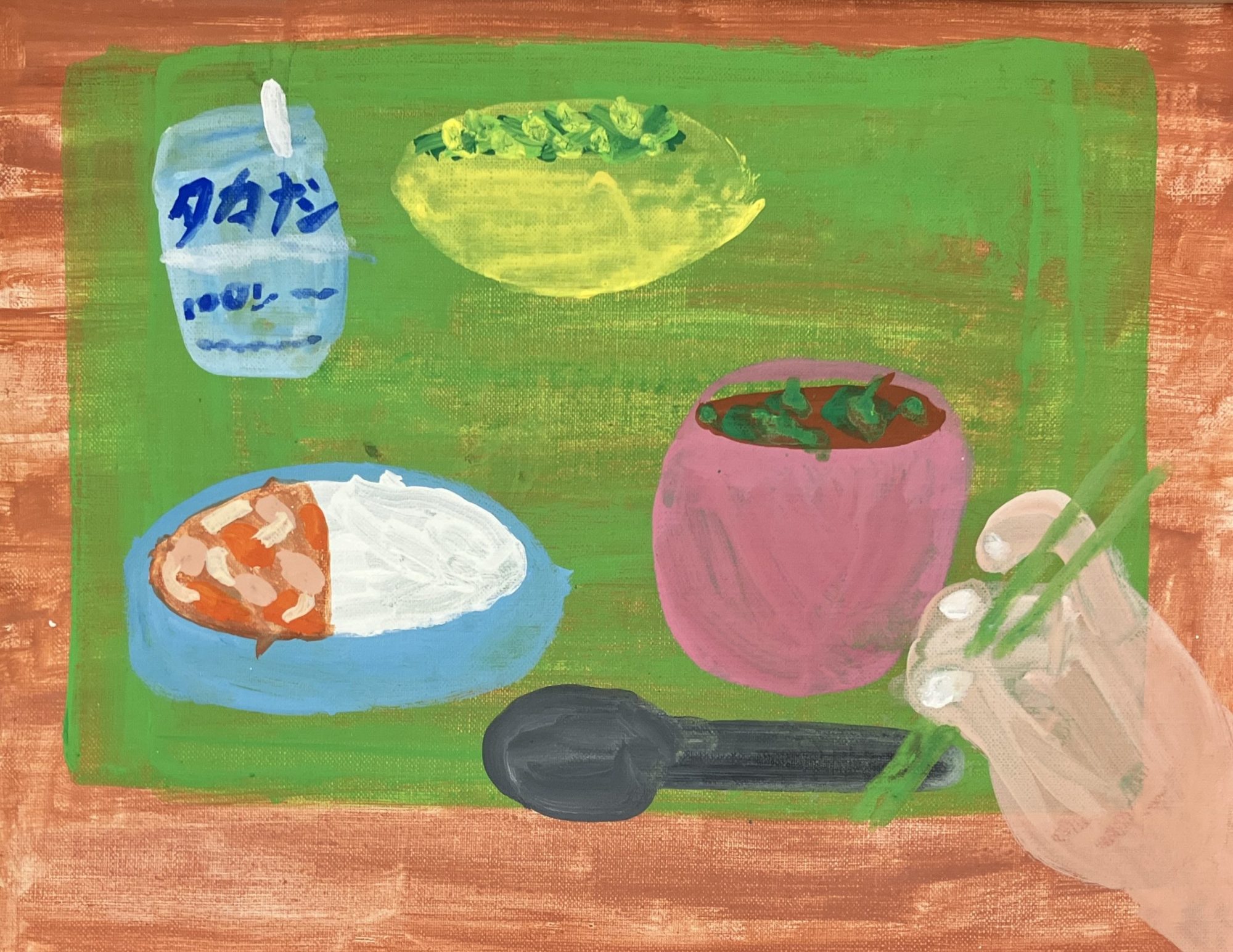 水色やピンクの器、黄色いお皿の中の野菜、そして牛乳パックの文字まで、一つひとつをとても丁寧に観察して描いていますね。タイトルにある「ほんとのきゅうしょく」という言葉どおり、YUIさんが毎日過ごしている大切な時間を、そのまま大切に宝箱にしまったような、素直なまなざしを感じました。✨