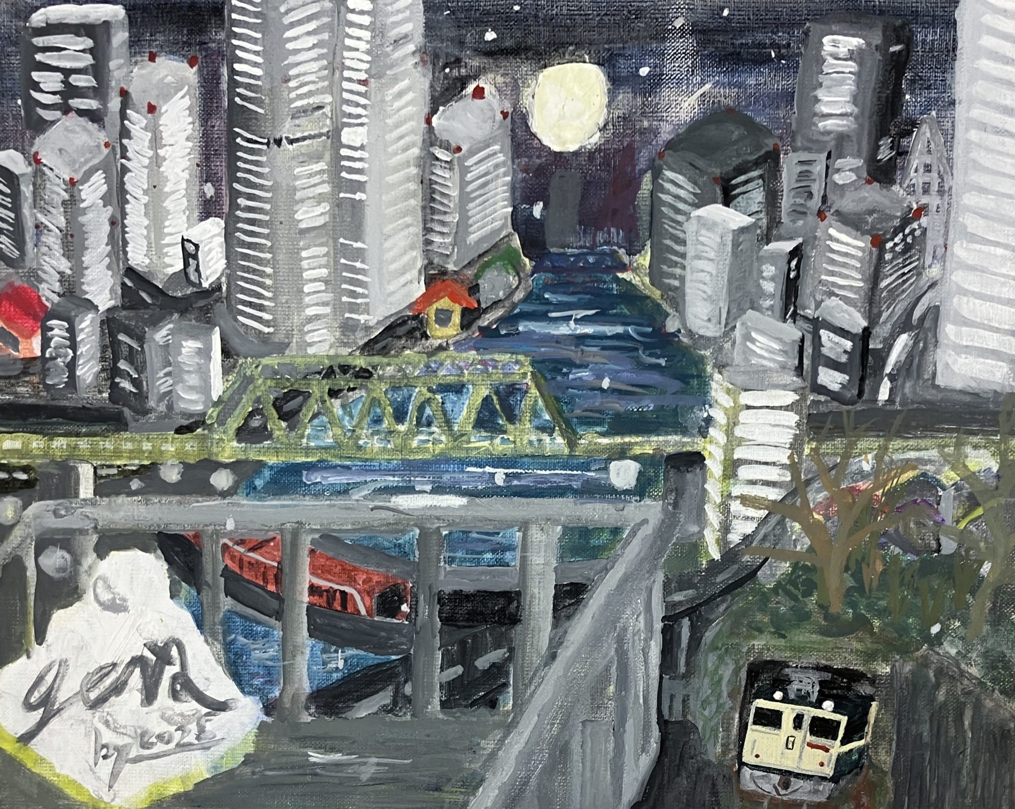 この絵を見ていると、静かな夜の空気の中に、電車の走る音や川のせせらぎが聞こえてくるような気がして、とても豊かな気持ちになります。自分の見た世界をダイナミックに表現できる力は、素晴らしい才能ですよ。🌕