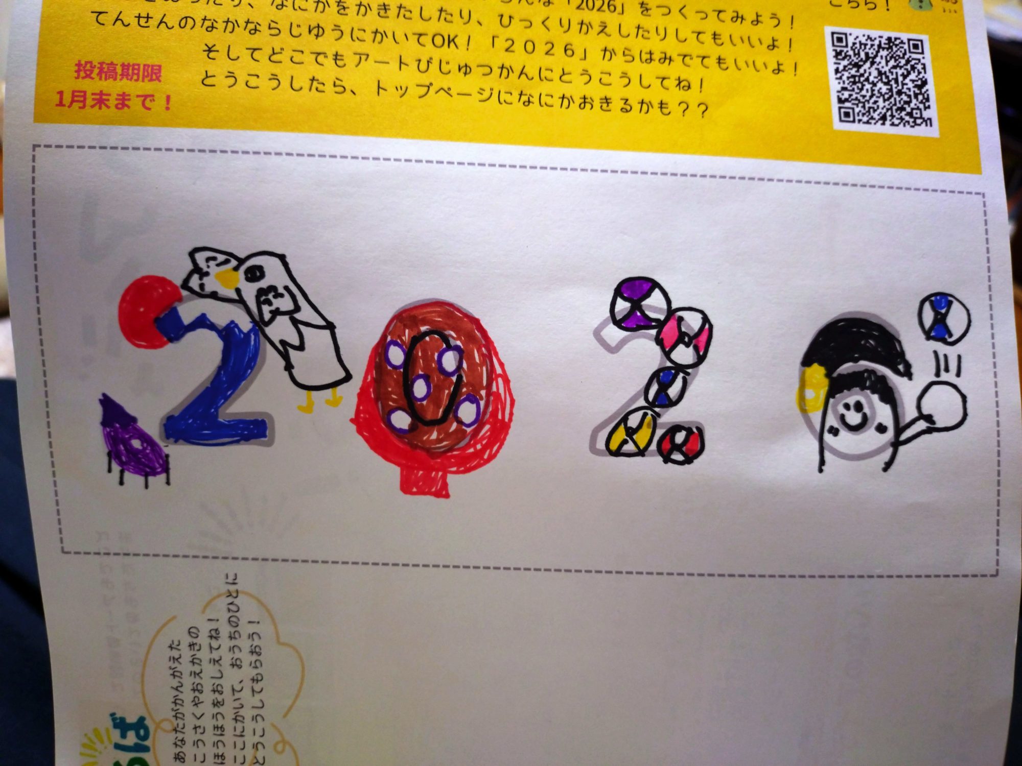 わかめせんせい 先生2025年12月21日 7:38 AM りとさんへ🎍✨ 数字そのものが、 もう“遊び場”になっていますね😊 「2」「0」「2」「6」 それぞれが、 ただの形じゃなくて、 なにかをしている存在に見えてくるのが楽しいです。 特に、 丸や線の組み合わせを、 自分なりのルールで変えているところがいいですね。 「こうしたら面白いかも?」って考えた時間が、 ちゃんと画面に残っています🌟 2026のこの数字たち、 もし声を出せるとしたら、 どんなことをおしゃべりしていそうかな? ログインして返信する ↓