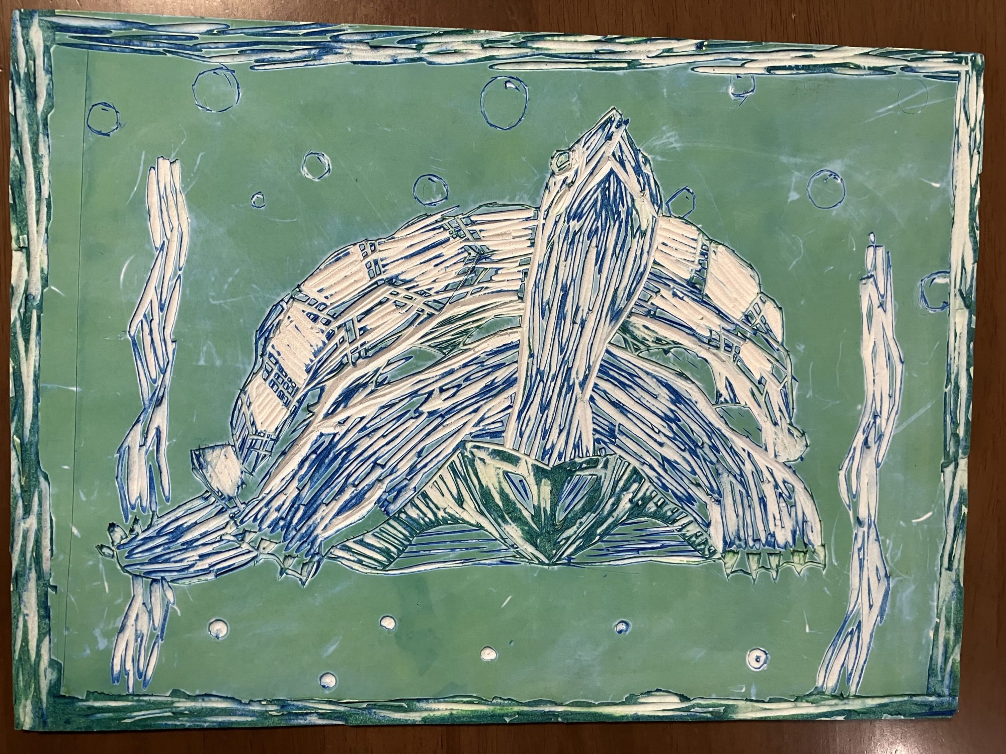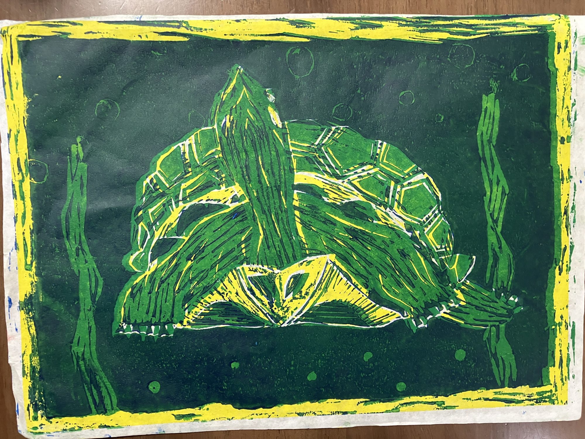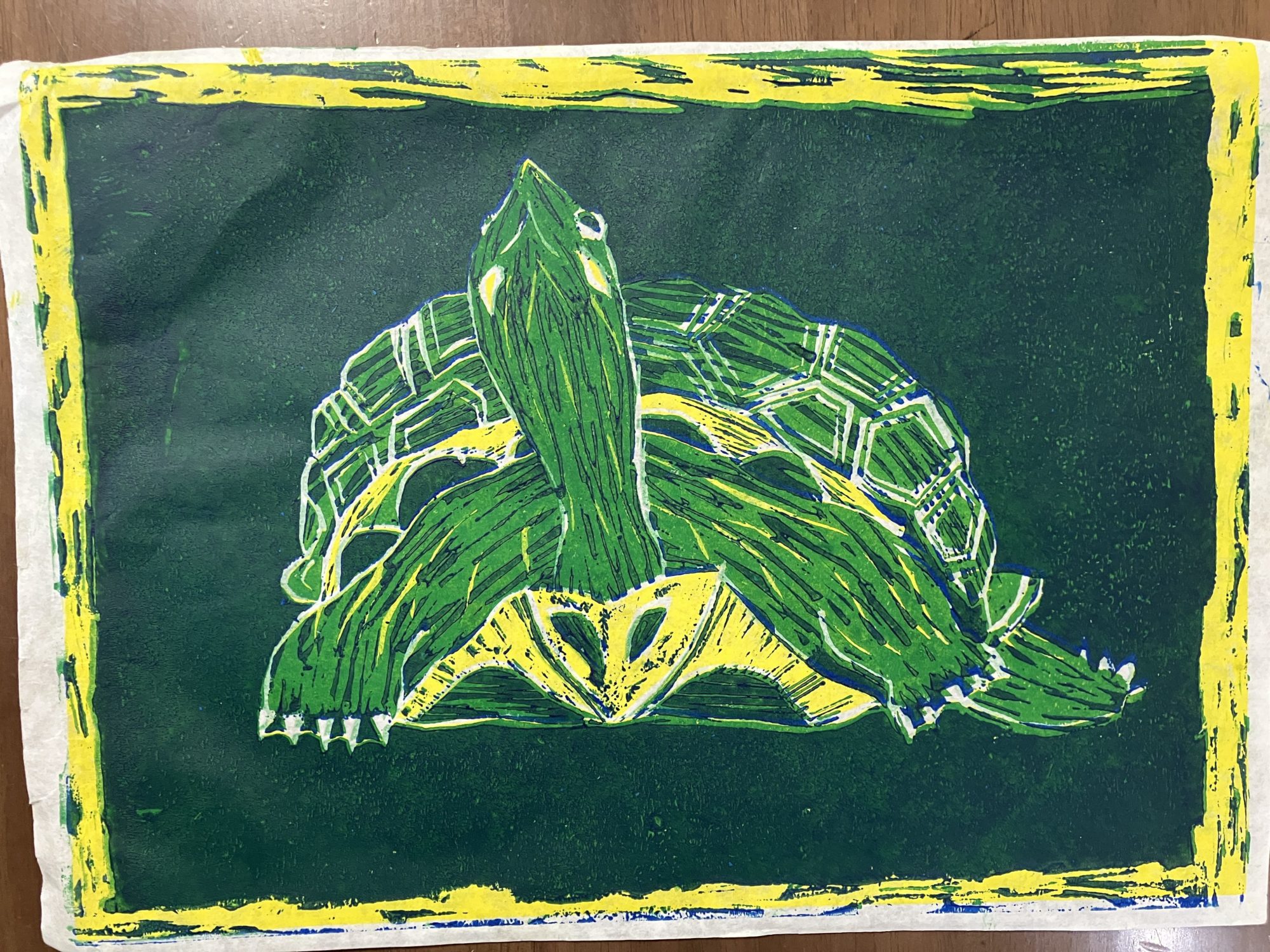 図工の「ほり進み版画」という授業で制作した作品です。彫りと刷りを繰り返しながら重ね刷りをして、だんだんとイメージに近づいていくのが面白かったです。背景を彫って刷ってみた結果、背景なしでカメだけのシンプルな方が好きだなと感じました。