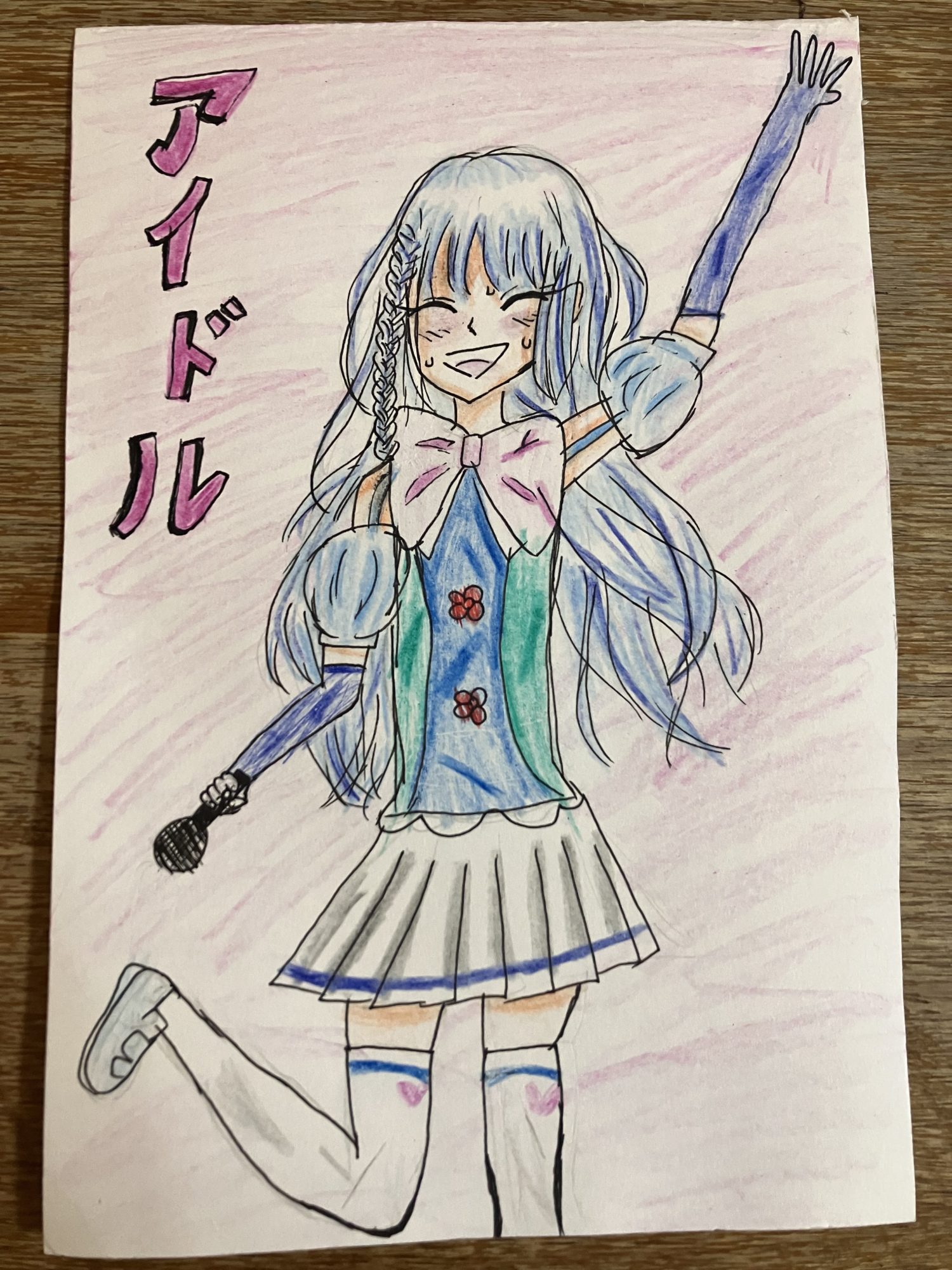 わかめせんせい 先生2025年12月23日 7:37 AM umimiさん、 まず、 このポーズと表情だけで 「アイドルだ!」って一瞬で伝わってきます✨ 手を高く上げた腕、 少し跳ねた足、 そしてこの笑顔。 ステージの空気がちゃんと描かれています🎤💖 洋服のデザイン、 むずかしかったと思うけれど、 リボン・袖・スカートの重なりが キャラクターの動きに合っていて、 「歌って踊る服」になっていますね。 特に、 色の組み合わせがやさしくて、 髪の色ともよくなじんでいるところが素敵です🌈 細かいところまで考えた跡が、 線や色からちゃんと見えます。 「むずかしかった」と感じた経験は、 次の一枚で もっと自由に描ける力になりますよ🎶 ログインして返信する ↓