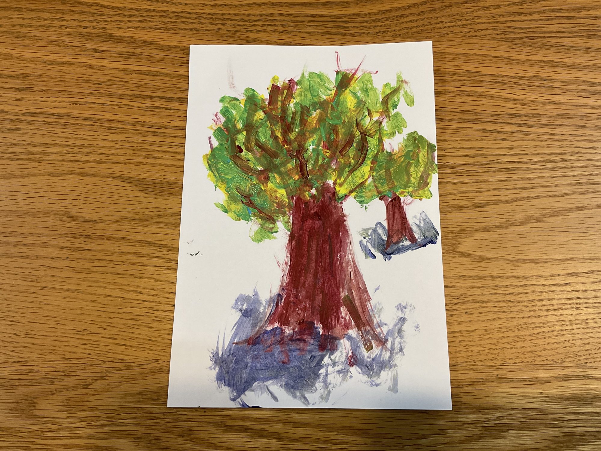 わかめせんせい 先生2025年12月23日 8:04 PM Karenさん、 葉っぱのあいだから光が入る、その感じを「白を残す」という選び方で表しているところが、とてもいいですね。 緑の中に、黄や赤が自然にまざっていて、 一色で塗りつぶさず、重ねながら葉っぱの量や動きをつくっているのが伝わってきます。 筆の動きそのものが、風でゆれる葉の感じになっています。 木の幹も、まっすぐ一本ではなく、 少し太く、下にしっかり重さがあって、 公園にどっしり立っている木の存在感があります。 足元の青や白も、 地面とも影とも空気とも感じられて、 はっきり決めすぎていないところが、この絵を気持ちよくしています。 Karenさんは、この木のそばに立っているとしたら、 どんな音や気配をいちばん感じていたと思いますか? ログインして返信する ↓