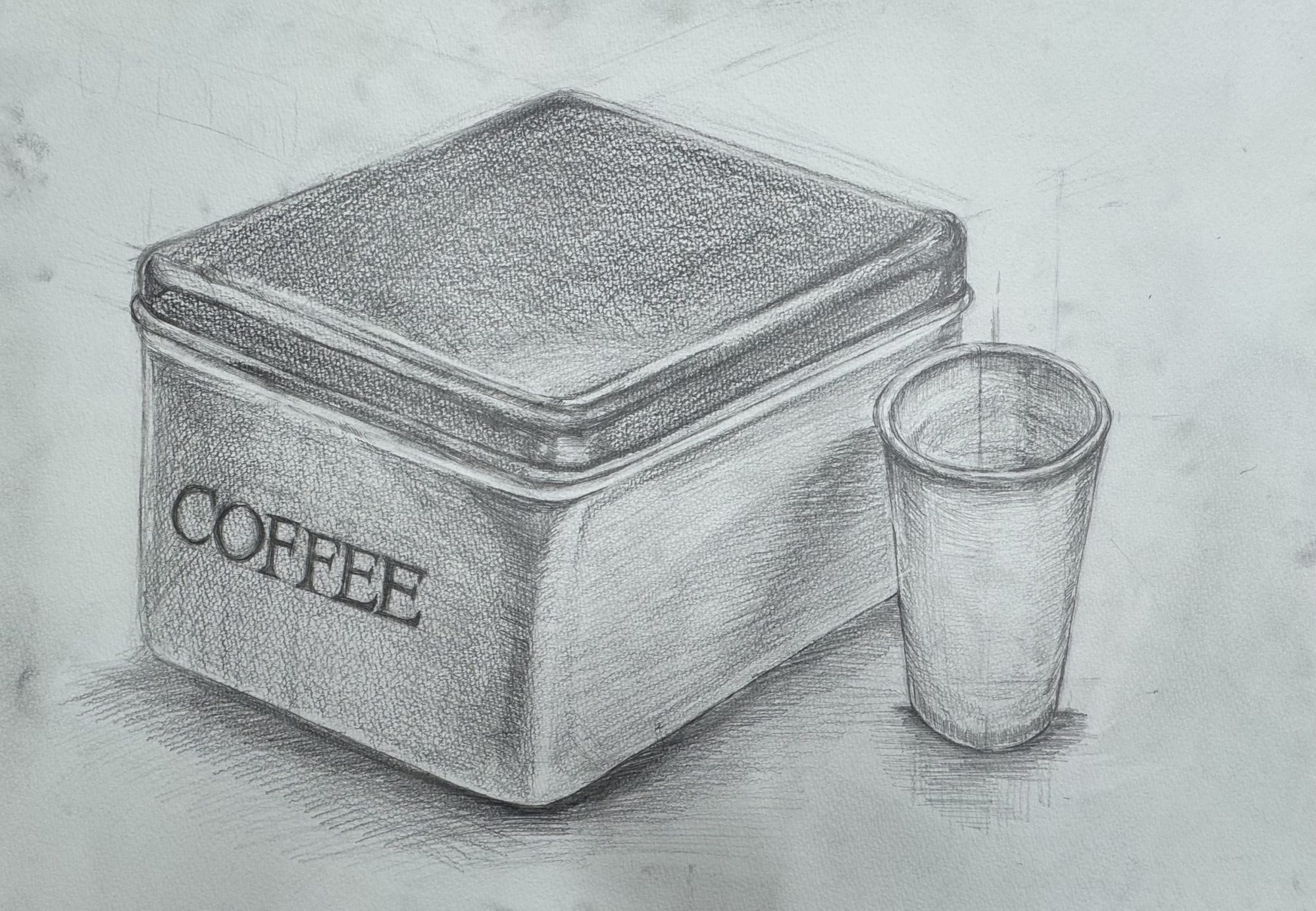 固い缶と透明なコップ、それぞれの素材の違いが丁寧な鉛筆のタッチで表現されていますね。
