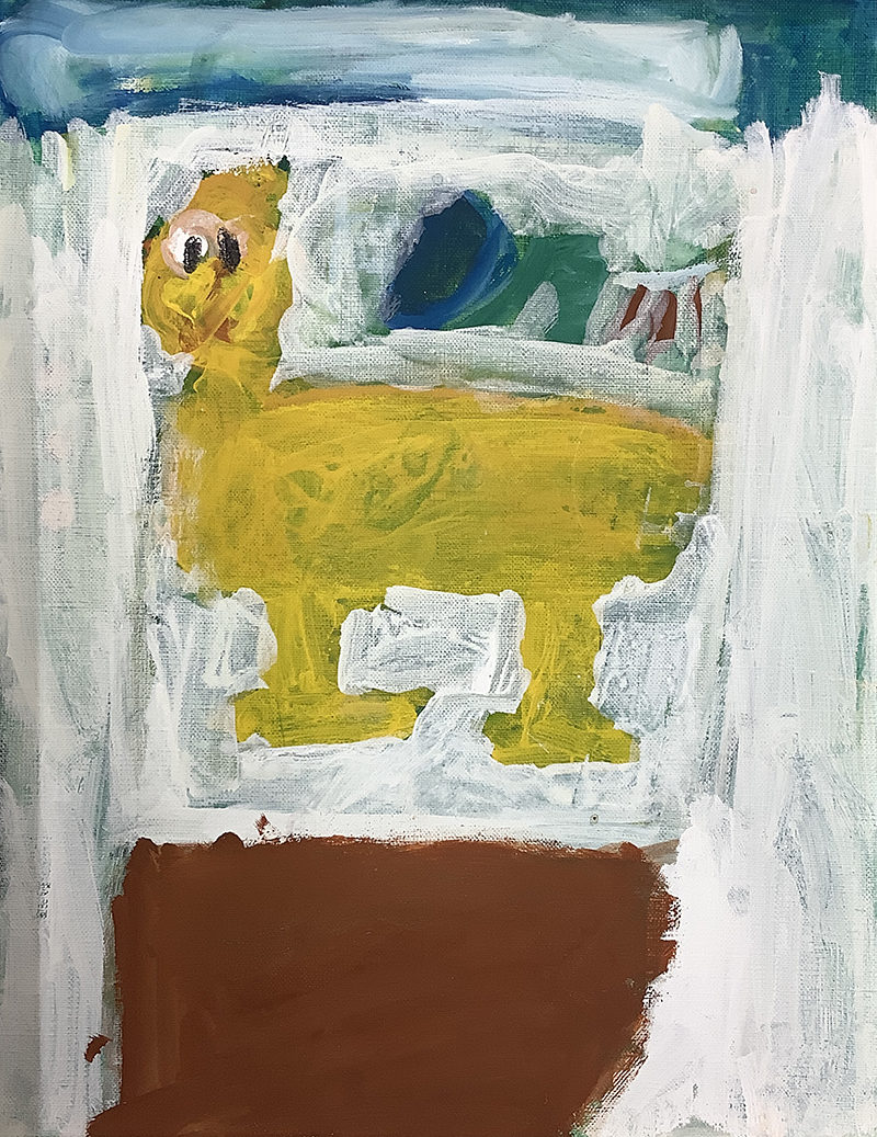 まわりを囲む白い形は、ガラスやさくのようにも見えて、「見る側」と「見られる側」の関係を考えながら描いていたのかな、と想像しました。