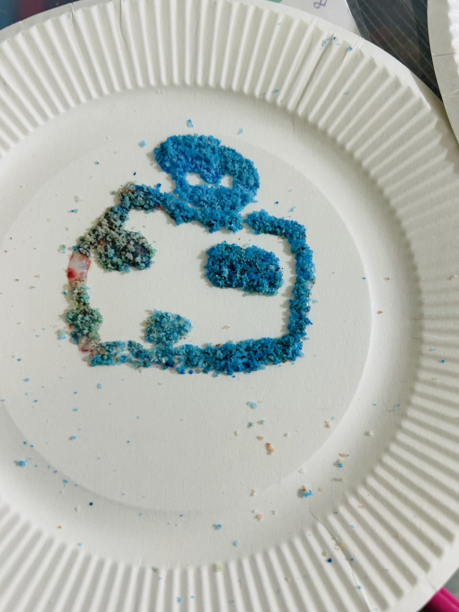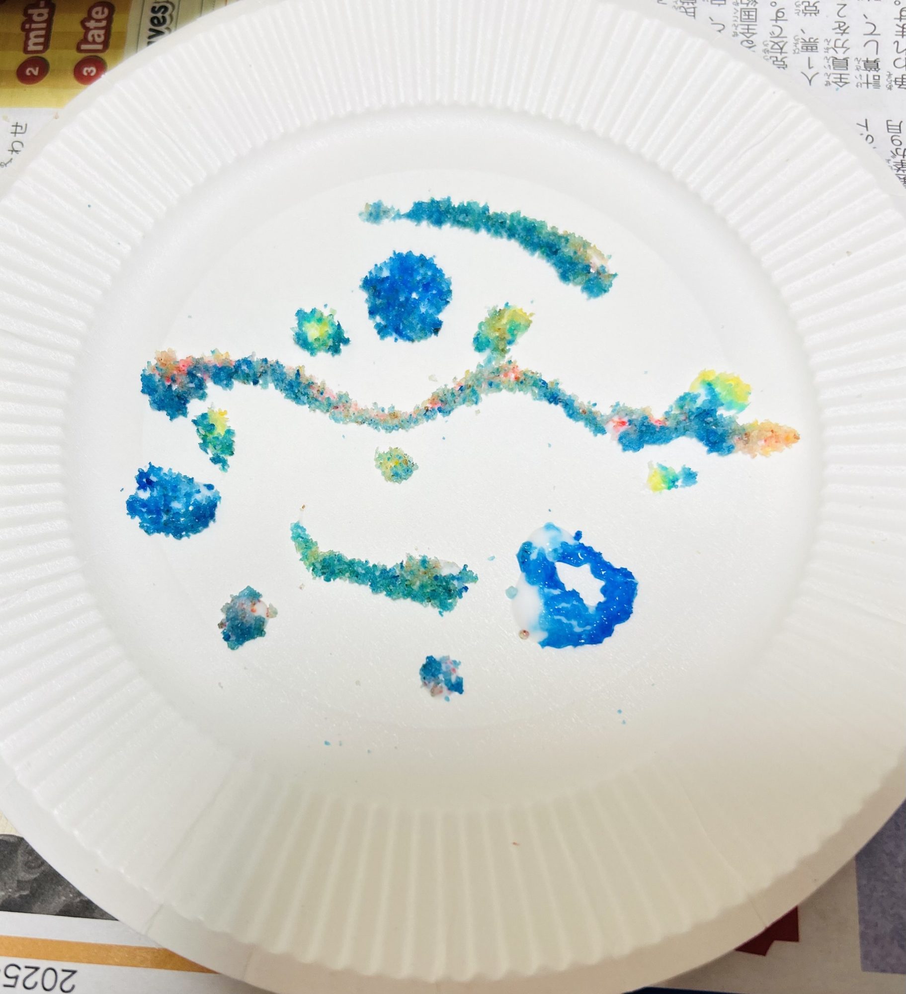 白いお皿の上に、色のついた塩が点や線になって並び、青や緑がやさしくにじみ合っています。粒の集まり方で形やリズムが生まれ、余白とのバランスも心地よいですね。