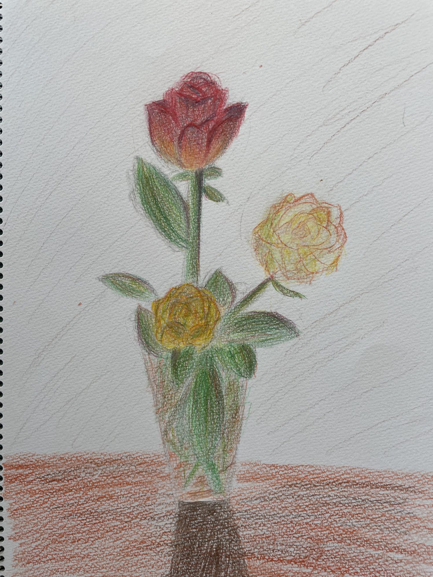 三つの花がそれぞれ少しずつ違う色合いで描かれ、花びらの重なりや開き方に目がとまります。色鉛筆の線を重ねることで、やわらかな明るさや白に近い感じを探している様子が伝わってきます。