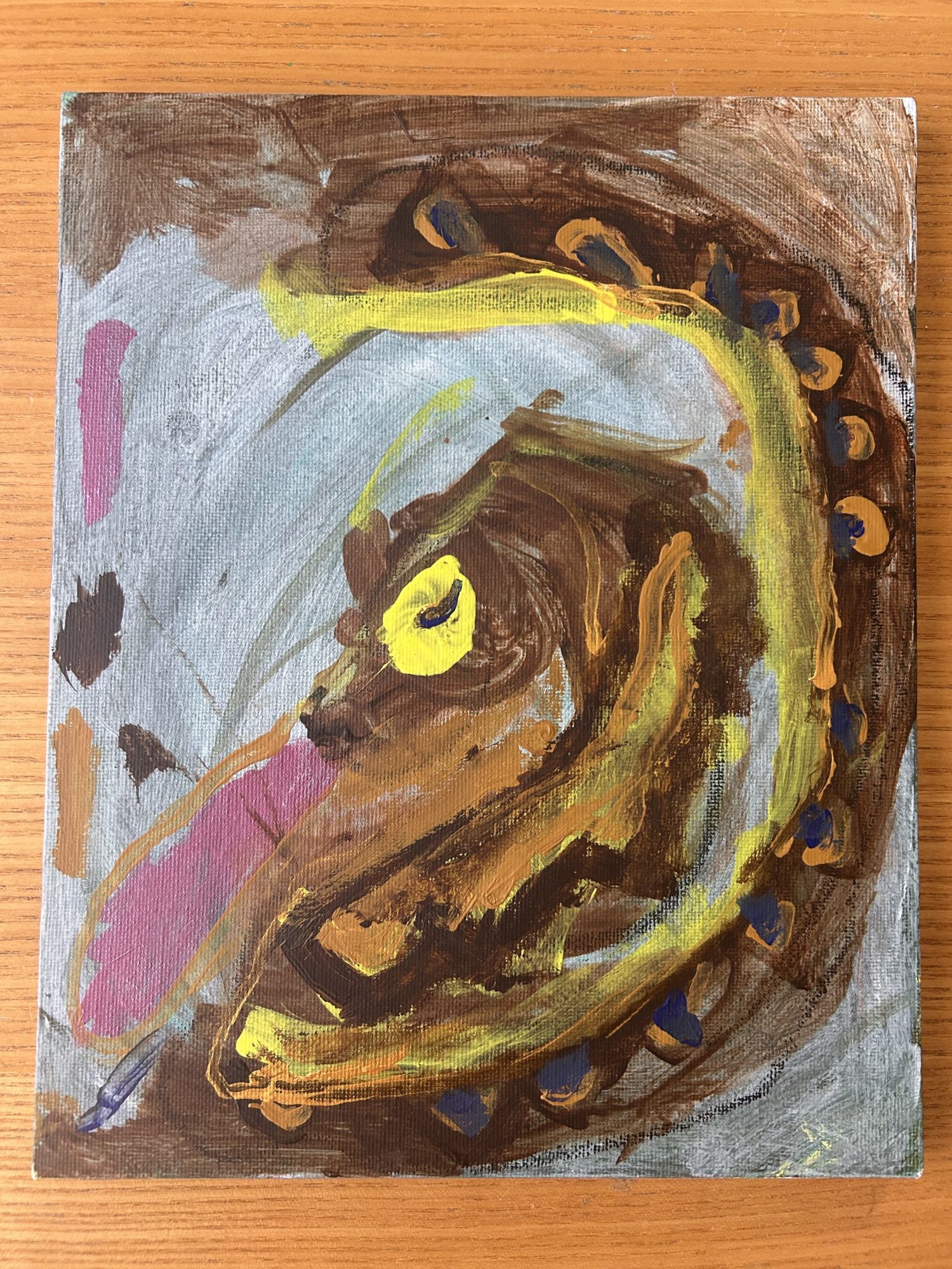 わかめせんせい 先生2025年12月30日 9:09 AM えいとさん。 ぐるっと円をえがくようなへびの体が画面いっぱいに広がり、黄色の線や点がリズムをつくっていて、まるで指輪そのものが動いているみたいですね🐍✨ 茶色を重ねた筆あとから、へびのぬくもりや力強さが静かに伝わってきます。 「なかまをさがしている」という言葉に、目の黄色がきらっと光り、少しドキドキしながら進んでいる気持ちを感じました。 輪になる形を選んだことで、終わらずにつながる時間や思いが生まれているのも素敵です🌙🟡 このへびさんは、どんななかまに出会いたいと思っているのかな? ログインして返信する ↓