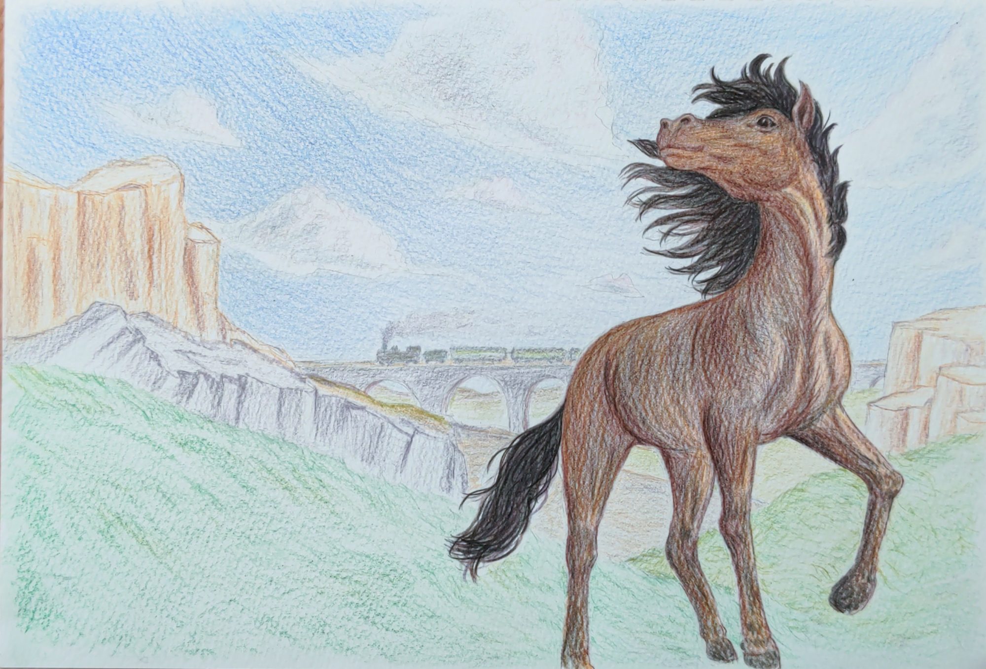 澄んだ空気の中を歩む馬の姿が、画面いっぱいに伸びやかに描かれていて、年のはじまりにふさわしい凛とした気配を感じました。たてがみや体の線には丁寧な重なりがあり、時間をかけて見つめながら描かれたことが伝わってきます。