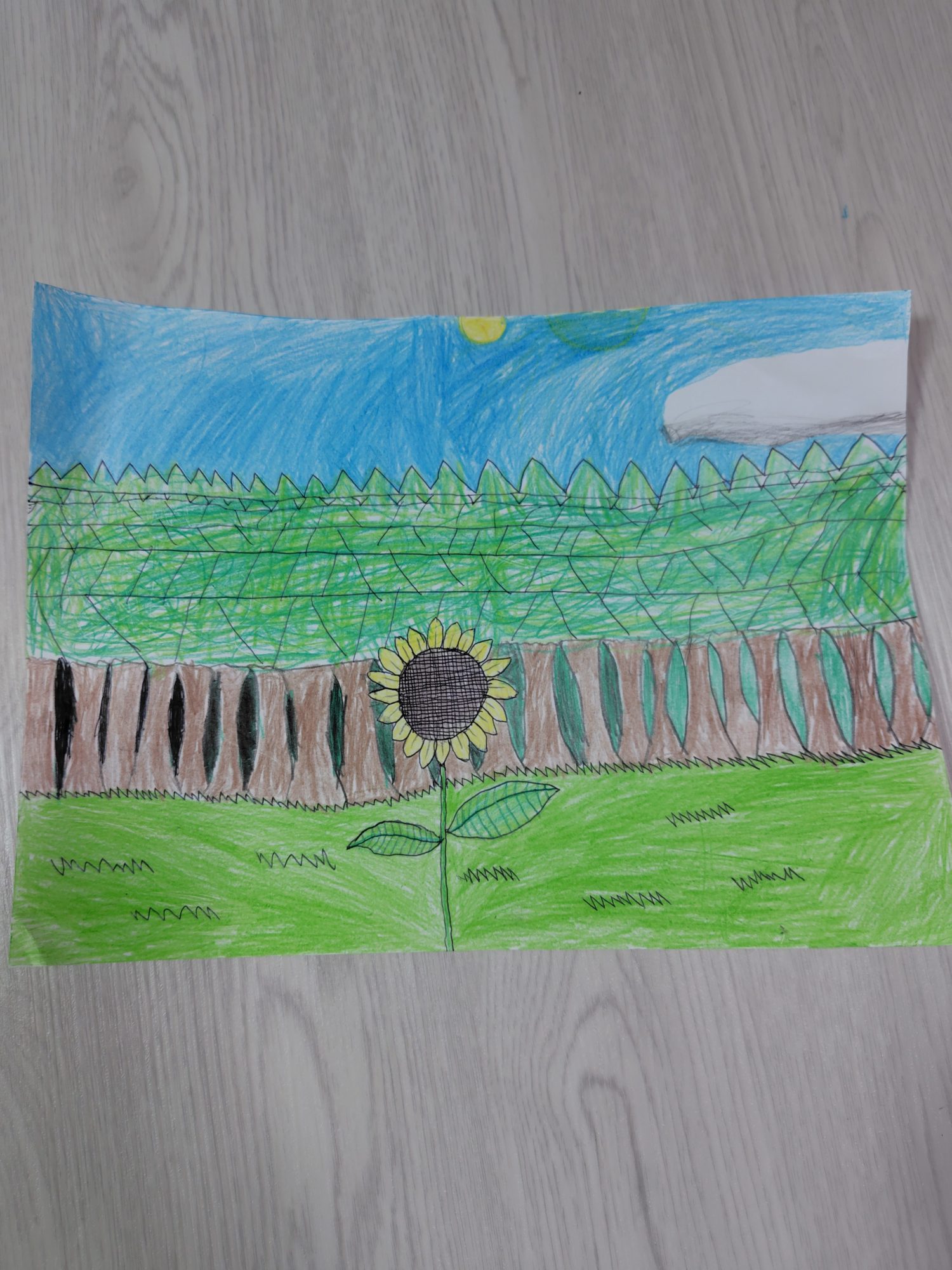 この絵の構図…何となくどこかで見たような……と思っていたのですが、昨年の夏に従姉妹のヒマリちゃんが号泣した時に描いてあげたヒマワリの絵を年始にヒマリちゃんに会った時に思い出してもう一度描いてみたと言う事でした(^o^)