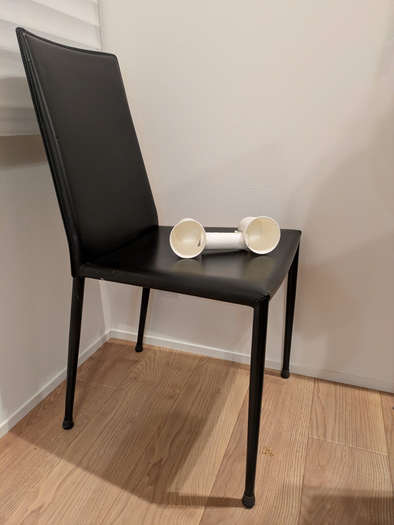 左右に開いた紙コップの向きや角度が、音を集めて遠くまで運ぼうとしているのがよく伝わってきます。