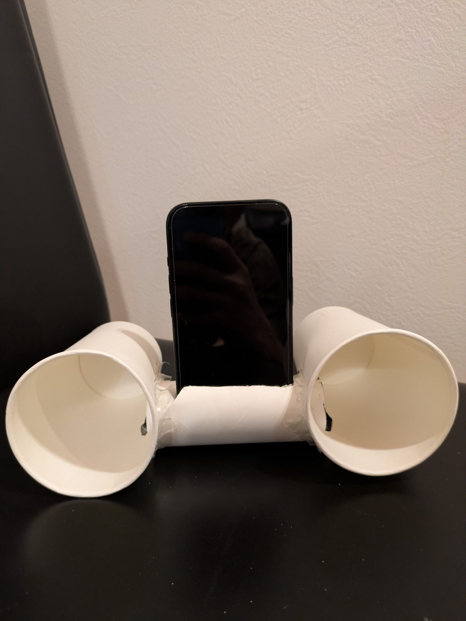 紙コップ2つとトイレットペーパーの芯というシンプルな素材なのに、音が前に広がるしくみをしっかり考えて形にしていますね📱🔊